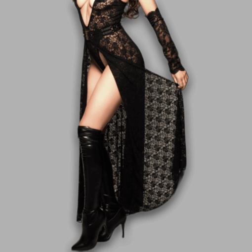 Crafted from delicate sheer lace in sophisticated black with subtle gold accents, the skirt softly drapes around the body, creating graceful movement with every step. The long, flowing cut enhances the silhouette, while the transparent texture reveals just enough skin to remain seductive yet refined.