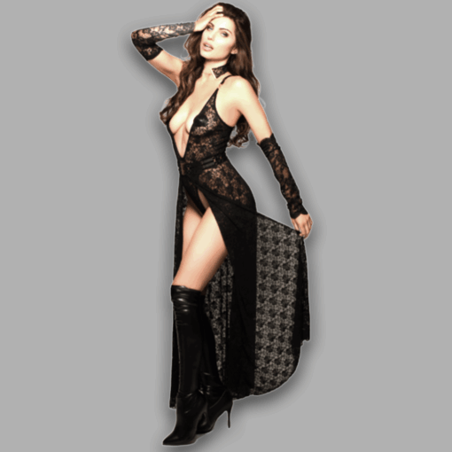 Crafted from delicate sheer lace in sophisticated black with subtle gold accents, the skirt softly drapes around the body, creating graceful movement with every step. The long, flowing cut enhances the silhouette, while the transparent texture reveals just enough skin to remain seductive yet refined.