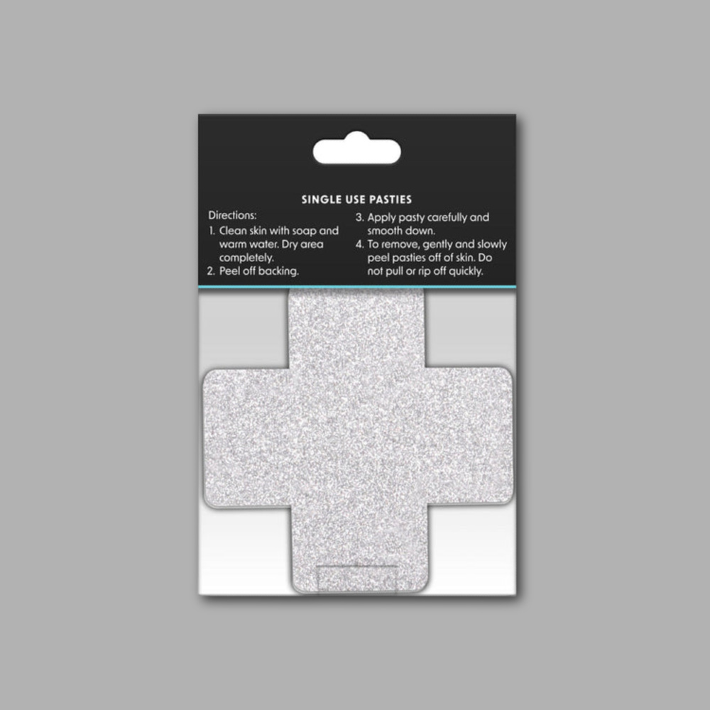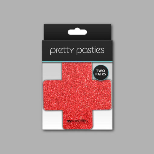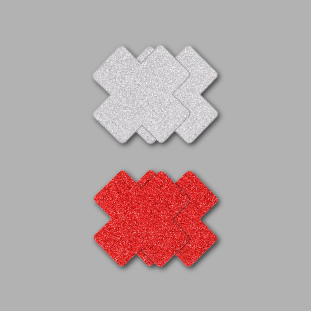 The Pretty Pasties Cross-Shaped Nipple Covers by bring sparkle and seduction to your look. Featuring glittering silver and bold red finishes, they add a striking accent to lingerie, fetishwear, or club outfits.