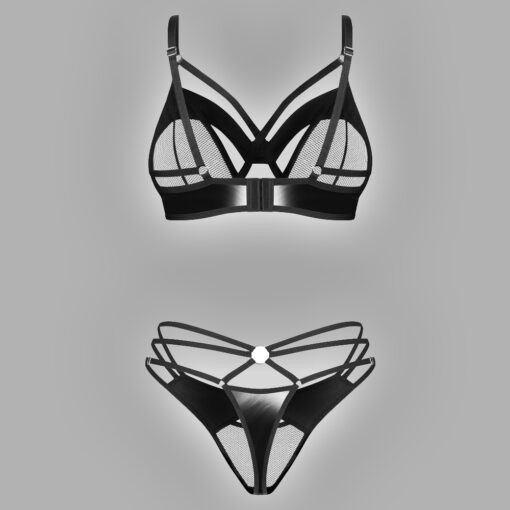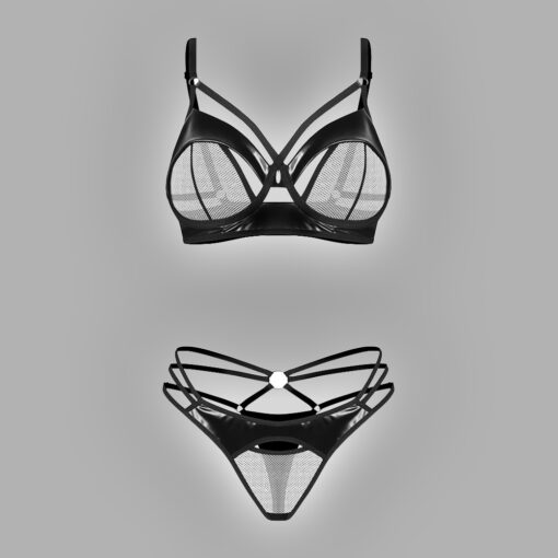 The 2-piece “Dominna” lingerie set by Obsessive boldly showcases sensuality with a dominant and elegant edge. This striking set consists of a wired bra and a string thong, featuring an exciting mix of wet look material and fine mesh fabric for a seductive contrast of shine and transparency.