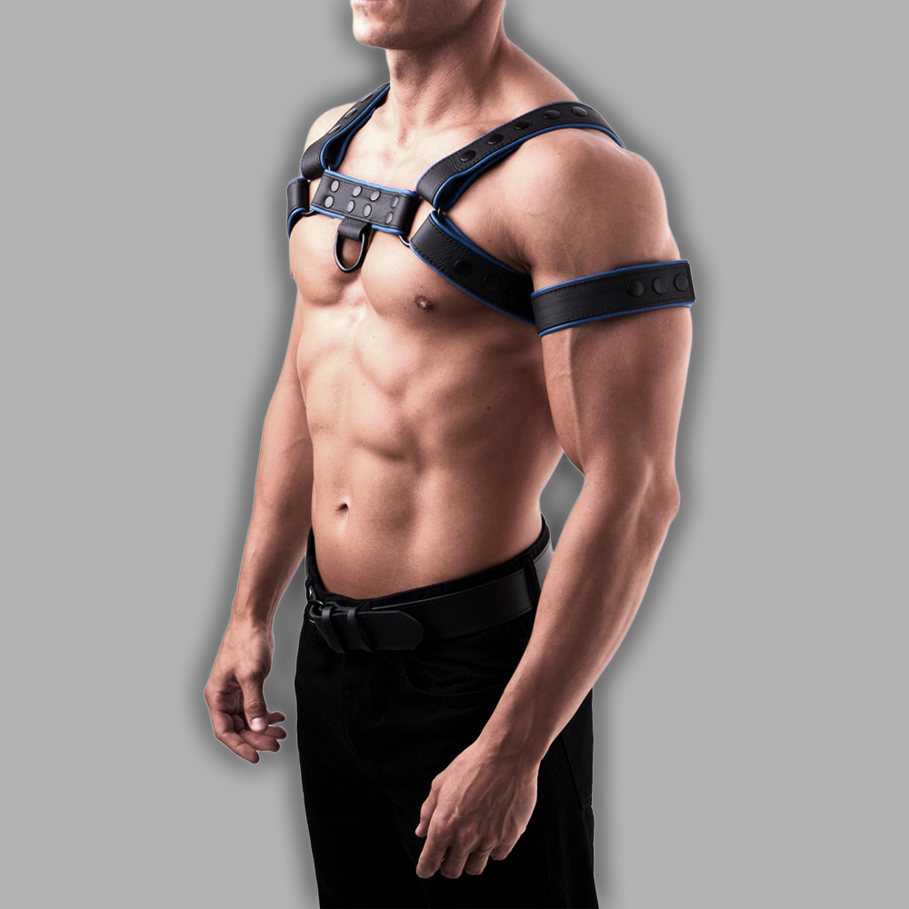 Striking chest harness made from high-quality leather with a durable four-layer construction. 4 cm wide leather straps, large metal rings, and snap buttons allow an adjustable fit. Black leather with blue piping creates a bold look – perfect for events and standout outfits.