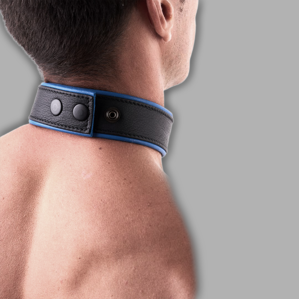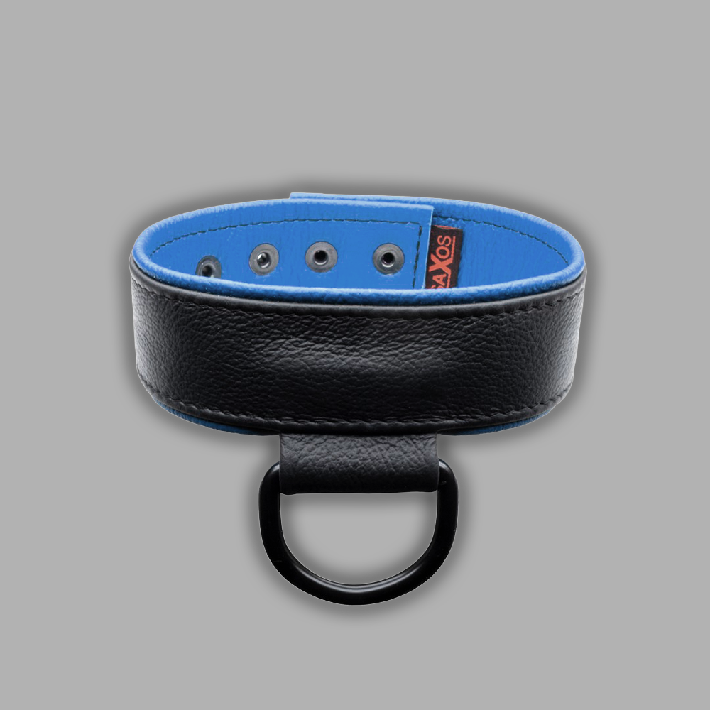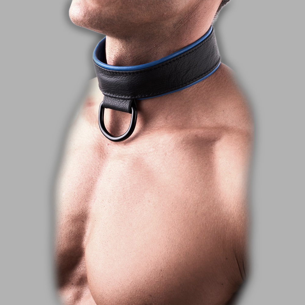 This high-quality leather collar in black and blue offers a clean minimalist design and comfortable wear. The strong D-ring provides a bold appearance and versatile functionality.