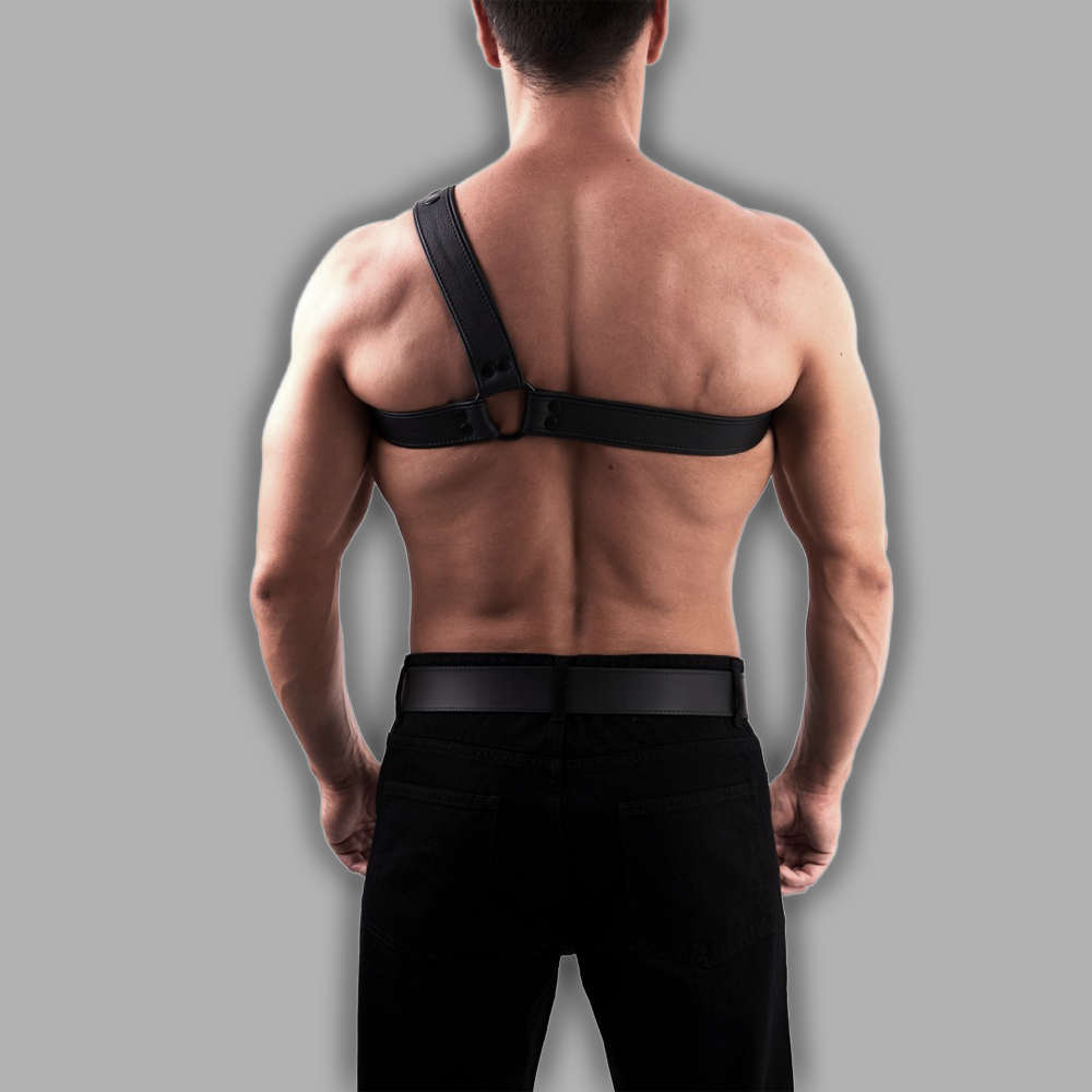 This Y-style chest harness combines bold design with high-quality leather craftsmanship. The 4 cm wide straps wrap comfortably around chest and shoulders and create a strong masculine silhouette. Multiple adjustment options allow a perfect fit and highlight the upper body.