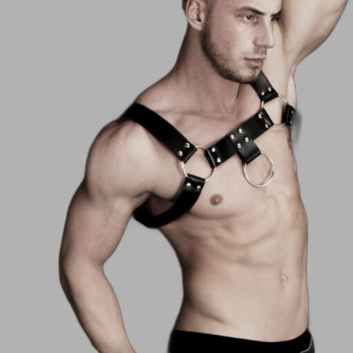 Bulldog Harness – bold. masculine. uncompromising. This powerful harness combines a dominant look with refined wearing comfort. Crafted from high-quality faux leather with a leather component, it stands out through its clean, confident lines and durable construction. Striking metal buckles and precisely placed details give the design a strong presence. Three large decorative rings on both the front and back create a central statement and complete the bold aesthetic. Four individually adjustable straps ensure an optimal fit and secure hold – maintaining comfort even during extended wear. Whether worn directly on the skin or over clothing, the Bulldog Harness works as both an intimate accessory and a confident statement piece for clubs, bars, or parties. Its solid construction shapes a defined silhouette and emphasizes a strong, masculine appearance. Sizes: S/M and L/XL
