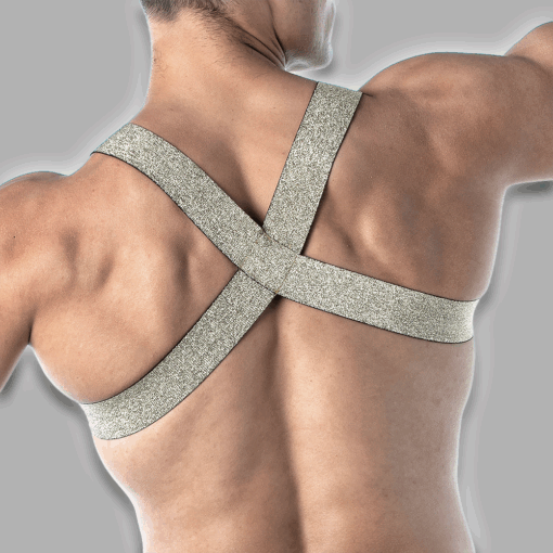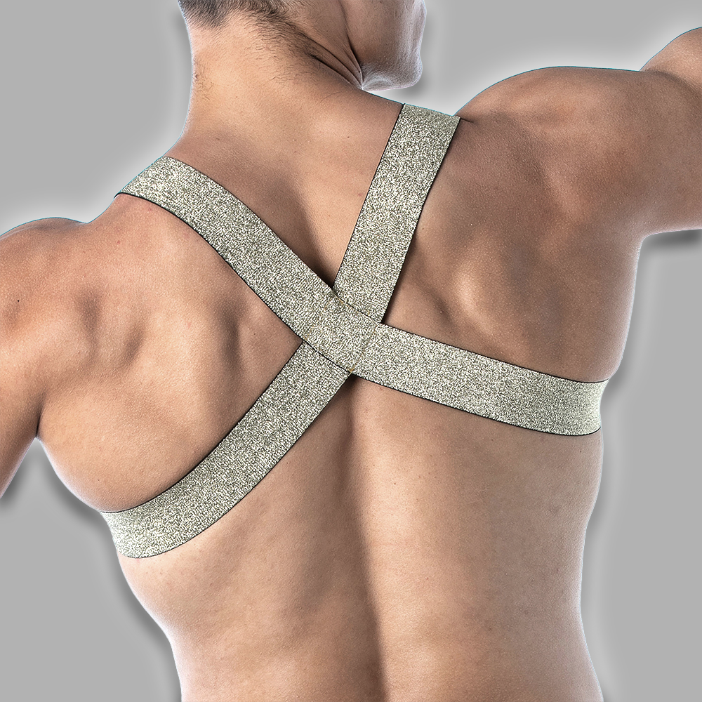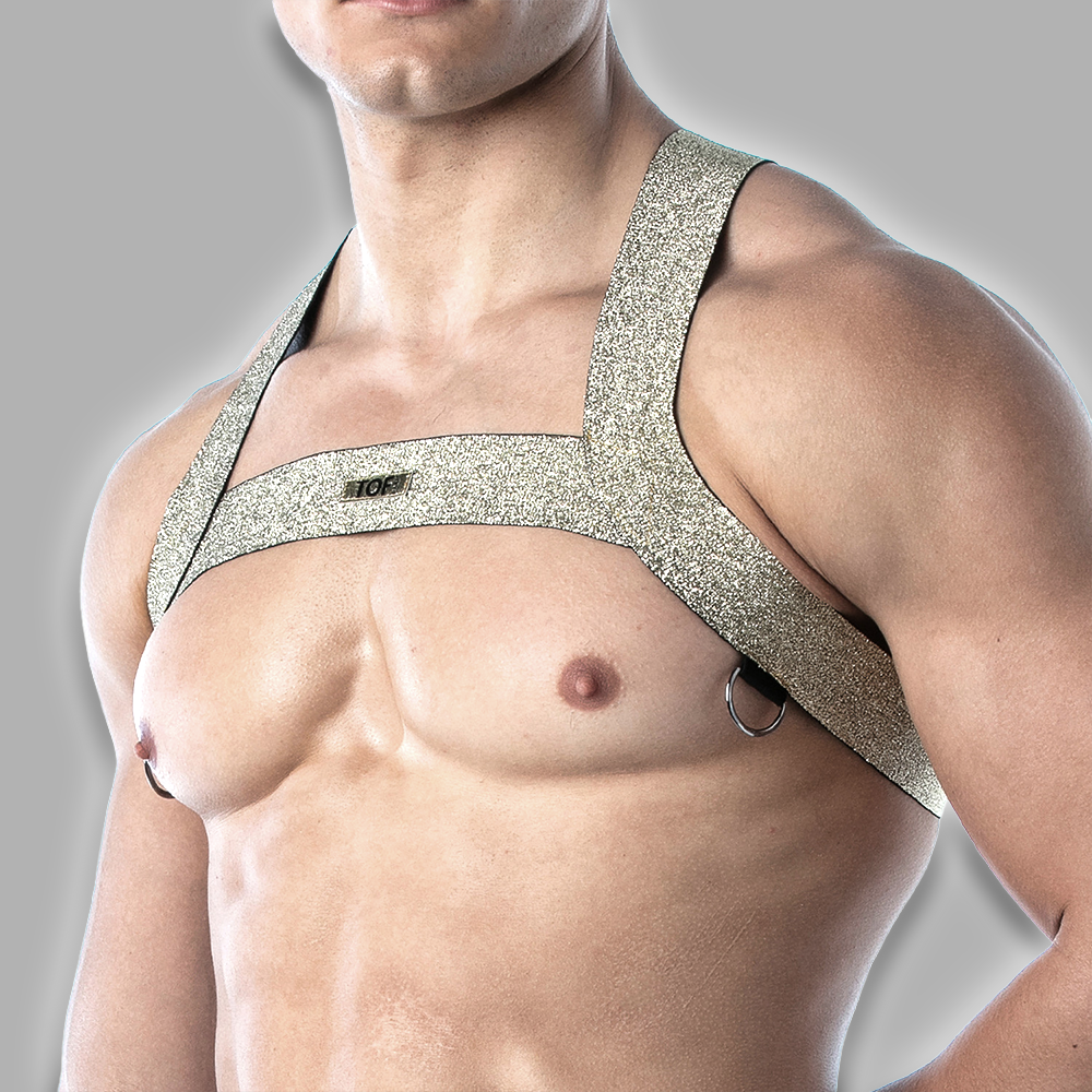 The Magic H Harness Gold by TOF Paris is a bold party and clubwear accessory designed for men who want to stand out with confidence and glamour. Its iconic H-shape highlights the chest and shoulders, creating a powerful and structured silhouette. Made from durable yet soft elastic lurex, this harness combines shimmering gold shine with exceptional comfort. The wide bands emphasize the upper body while ensuring flexibility and resilience—perfect for long nights at themed events, festivals, or club parties. The gold faux leather TOF logo adds an exclusive signature touch, reflecting Parisian craftsmanship and attention to detail. The elastic construction adapts naturally to the body, providing secure support without restricting movement. Whether worn on bare skin or paired with jockstraps, shorts, or pants, the Magic H Harness is a striking statement piece for glamorous fetish and clubwear styling. Designed and sewn in Paris.