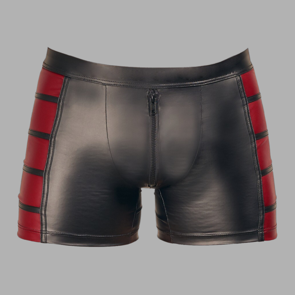 Short mit besonderen Details und cooler Farbgebung! Schwarze Short von NEK im trendigen Mattlook mit seitlichen, roten Streifen-Einsätzen. Vorne mit unterlegtem Reißverschluss, der sich für praktische und erotische Zwecke schnell öffnen lässt. Fantastisch elastisch für hervorragenden Tragekomfort.