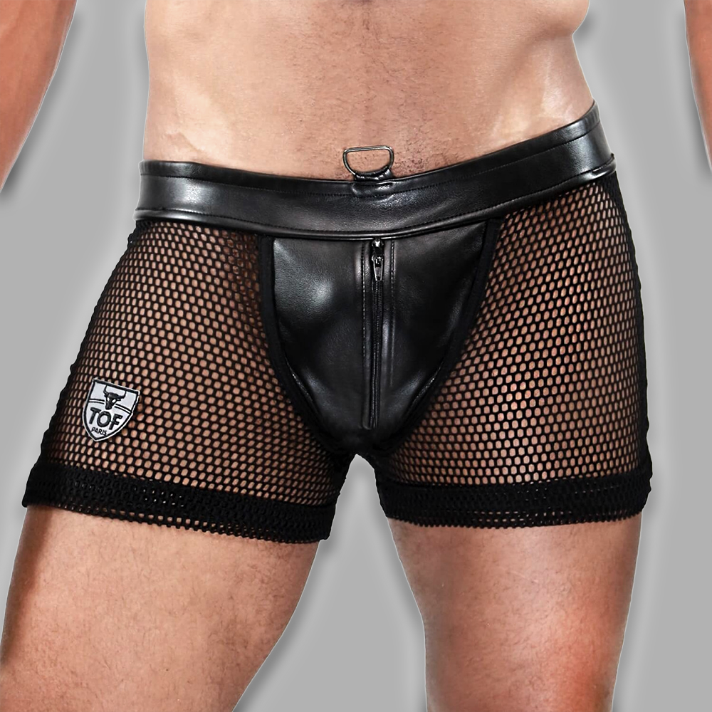 The Spartacus Full Zip Jockshort by TOF Paris represents a bold innovation in modern fetish and clubwear. This revolutionary design combines transparent mesh shorts with an integrated imitation leather jockstrap — daring, provocative, and unmistakably unique.