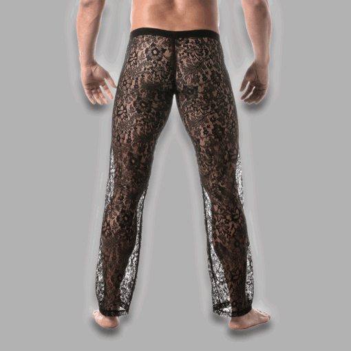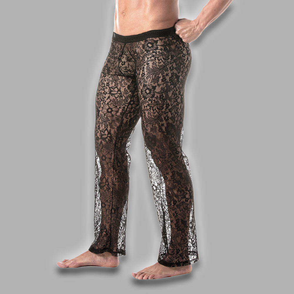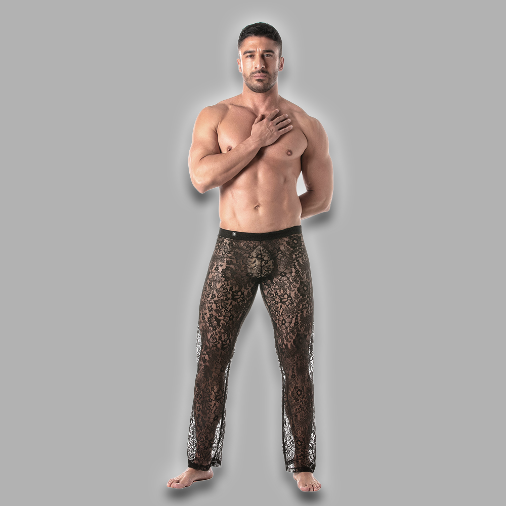 Crafted from high-quality black floral lace, the pants offer elegant, controlled transparency. The slightly stretchy fabric ensures comfort and freedom of movement, while the low-rise, form-fitting cut enhances the masculine silhouette. This perfect balance between comfort and provocative style makes them a standout piece in sexy men’s fashion.