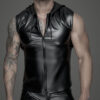Kapuzenshirt ohne Ärmel im Materialmix, aus der neuen Männerkollektion ‚Missbehaved“, von Noir Handmade.Wir haben für euch die coolsten Pieces ausgesucht. Der Hoodie ist aus feinem Lycra mit Tunnelzug gearbeitet. In Front ist ein Zwei-Wege Reißverschluss verarbeitet. Kinky Clubwear, absolut dresscodetauglich.
