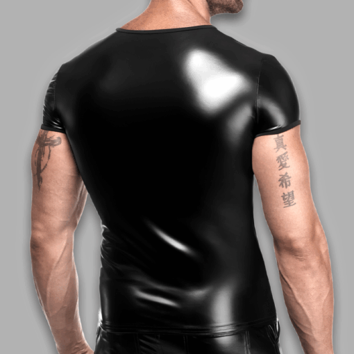 Durch den hohen Elastananteil passt sich der Stoff der Körperform an, formt leicht, bleibt dabei aber geschmeidig und angenehm zu tragen. Es ist ein Shirt, das gleichzeitig lässig, sexy und alltagstauglich ist – ein echtes Hybrid-Piece zwischen Fashion und Fetish-Ästhetik.