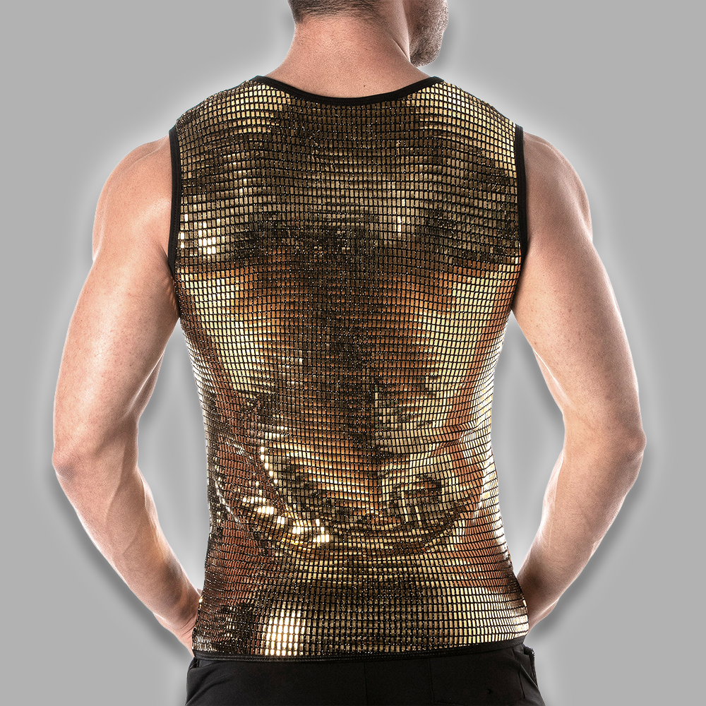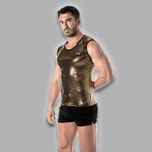 Goldenes Pailletten-Tanktop für Herren mit figurbetontem Schnitt und elastischen Abschlüssen. Glamourös, auffällig und perfekt für Clubwear oder Events.