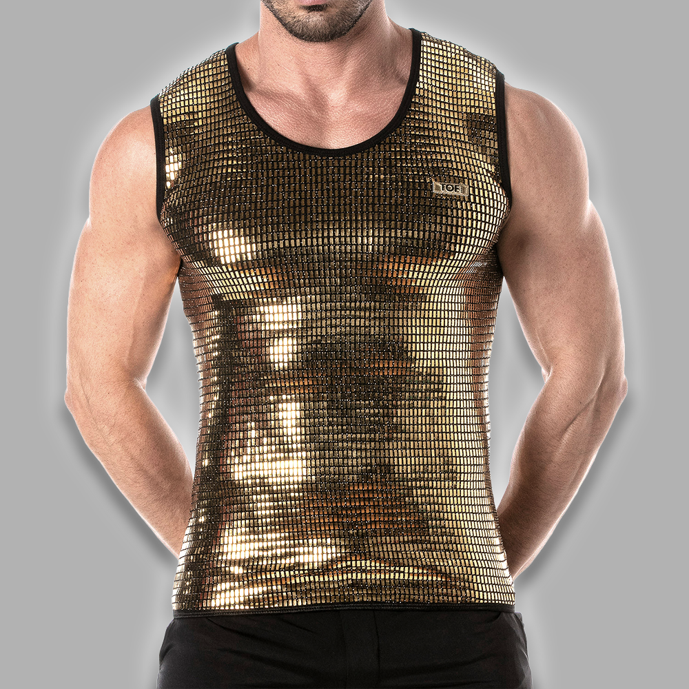 Gold sequin tank top for men with a fitted cut and elastic trim. Glamorous, eye-catching, and perfect for clubwear or special events.