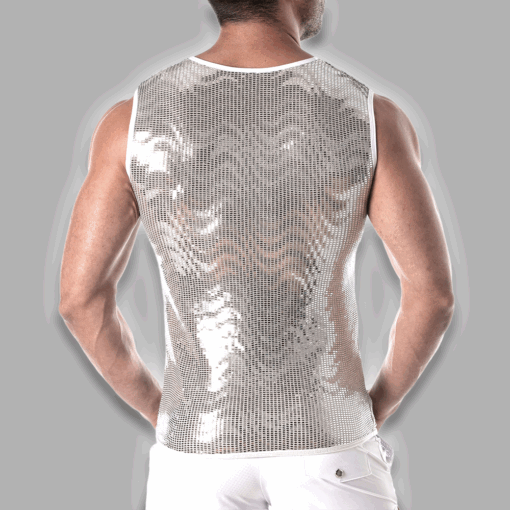 Das hochwertige Glitzermaterial ist innen weich gefüttert, sodass es angenehm auf der Haut liegt und auch bei längerer Tragezeit höchsten Komfort bietet. Der figurbetonte Schnitt unterstreicht Schultern und Oberkörper und verleiht eine klare, maskuline Silhouette. Ein edles TOF Paris Logo in Lederoptik, dezent über dem Herzen platziert, setzt ein exklusives Markenstatement.