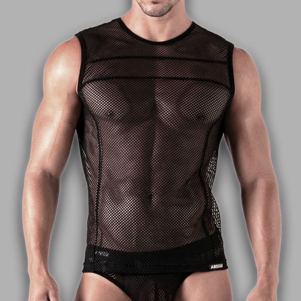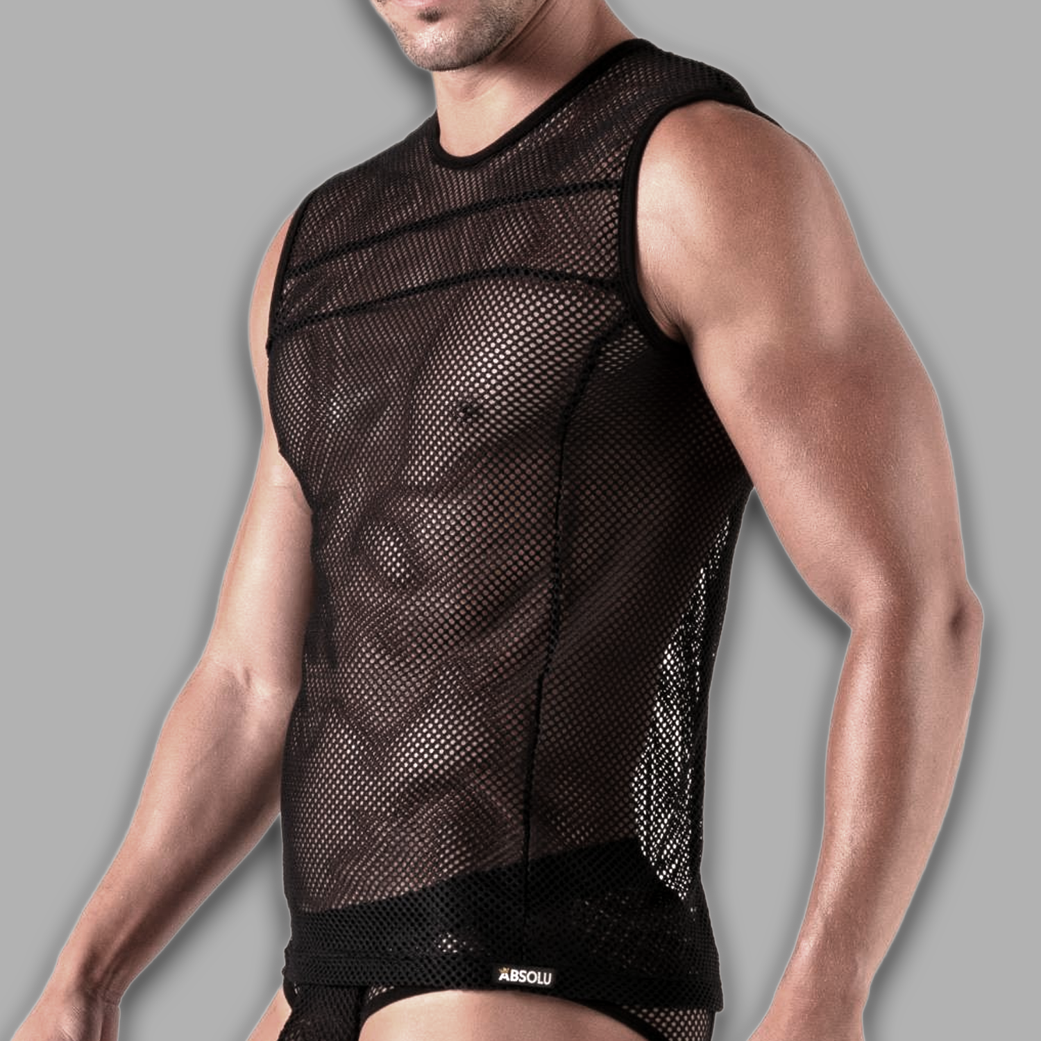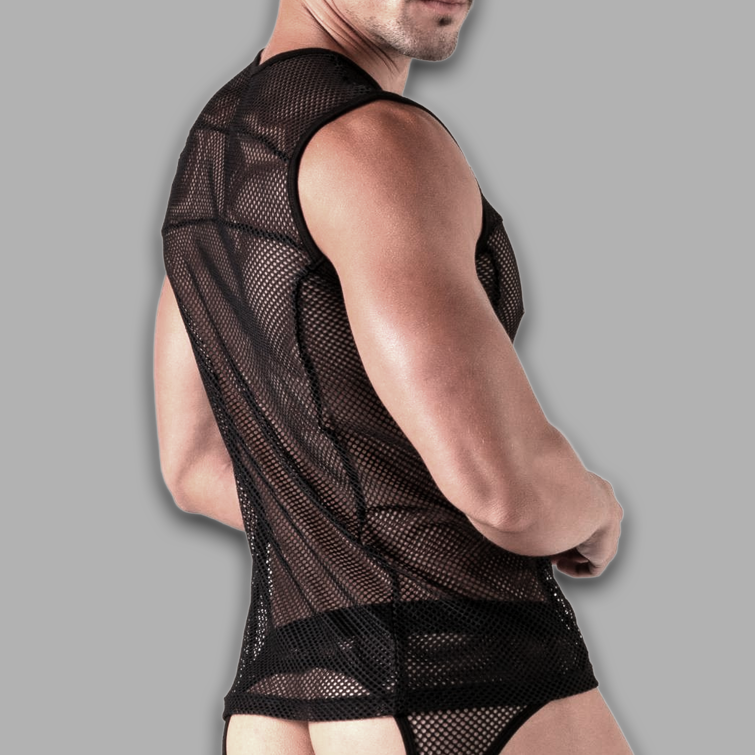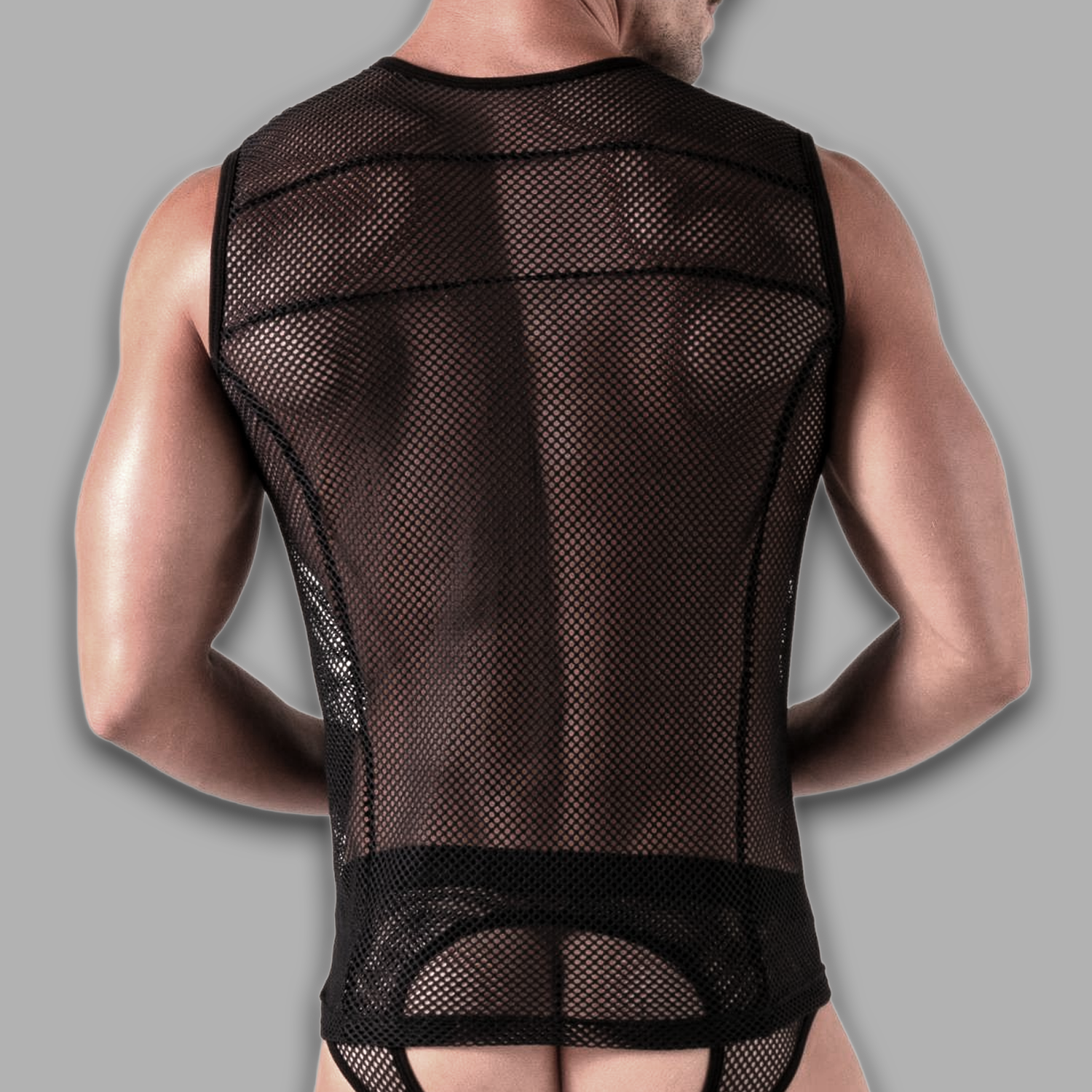 Light, body-hugging mesh tank top with contrast seams – handmade in Paris for bold, confident men.