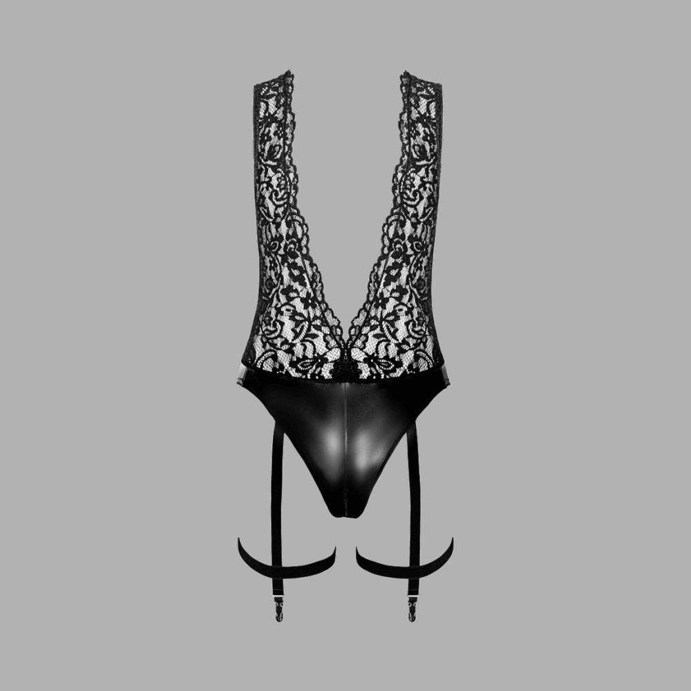 From the latest Noir Handmade collection, this striking bodysuit features a sophisticated mix of delicate lace and stretchy wetlook material. The contrast creates a bold yet elegant silhouette. A deep V neckline at both front and back, crafted from sheer lace, accentuates the décolleté and back beautifully. The integrated velvet collar is connected to the bodysuit by a black pearl chain, adding a refined, dominant touch to the overall design. The high-cut leg opening elongates the legs visually. Velvet leg bands in garter style are adjustable and equipped with clips, allowing attachment to hold-up stockings. A full-length zipper in the crotch ensures convenient wear and additional styling flexibility.