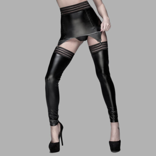 Sexy Srapsgürtel von Handmade Noir, mit 4 Strapshaltern. Der Strapsgürtel ist aus einem Wetlookmaterial und Bänderstrickung im Bund gearbeitet. Der Bund ist in Streifen vernäht, abwechselnd transparent und schwarz.