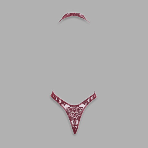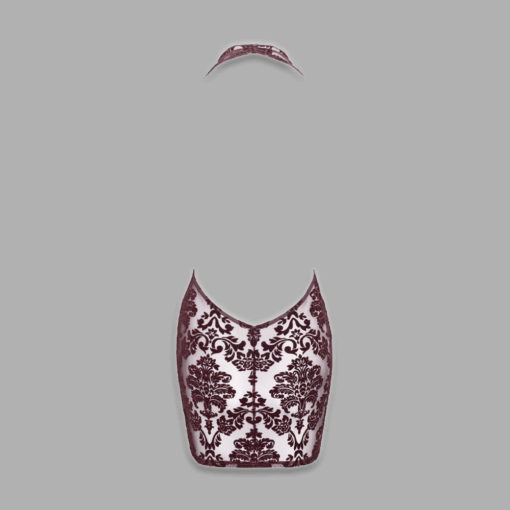 This burgundy flocked tulle bodysuit is the ultimate fusion of elegance and sensuality. Featuring a draped cowl neckline and a seductive open back, it makes a bold statement whether worn on its own or as part of a layered look.