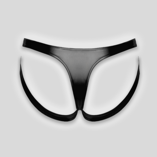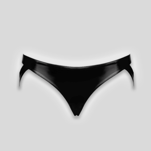 Wetlook panty with elastic leg straps and body-hugging fit. Glossy, modern, and bold.