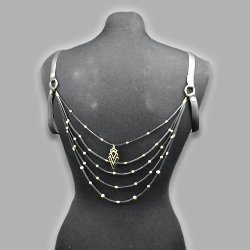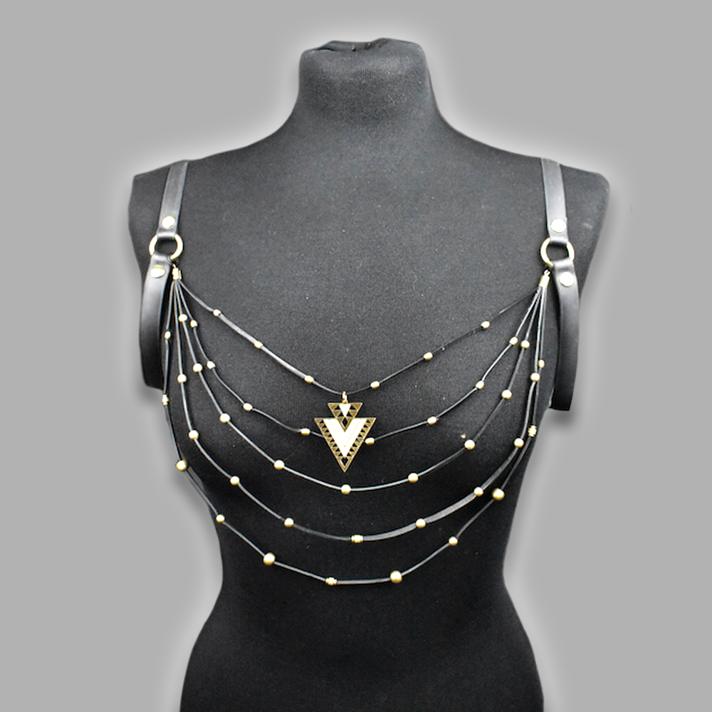 Available in deep black with either gold-tone hardware (brass beads and brass rings) or silver-tone hardware (stainless steel beads and stainless steel rings), this harness merges industrial materials with elegant structure. Its minimalist yet striking design makes it suitable for fetish events, clubwear, festivals, or as an avant-garde layering piece over sleek outfits.
