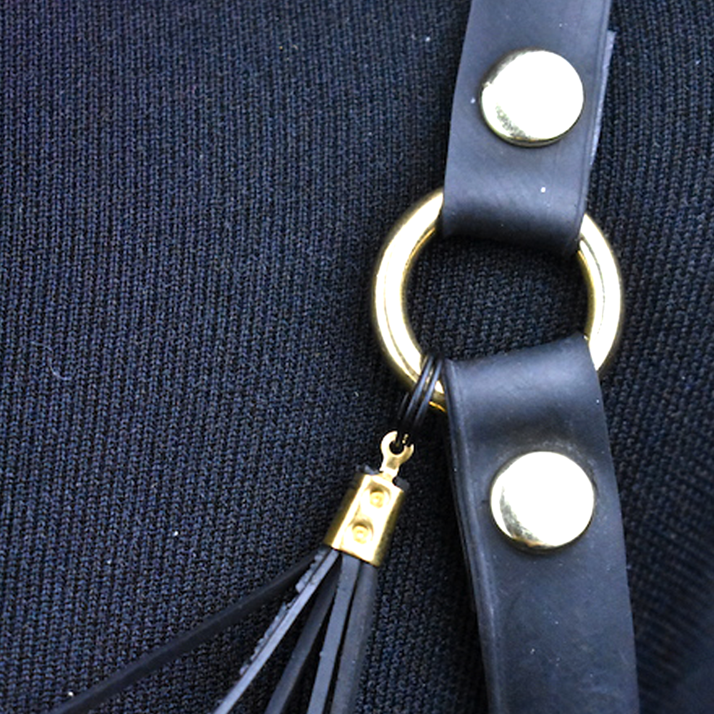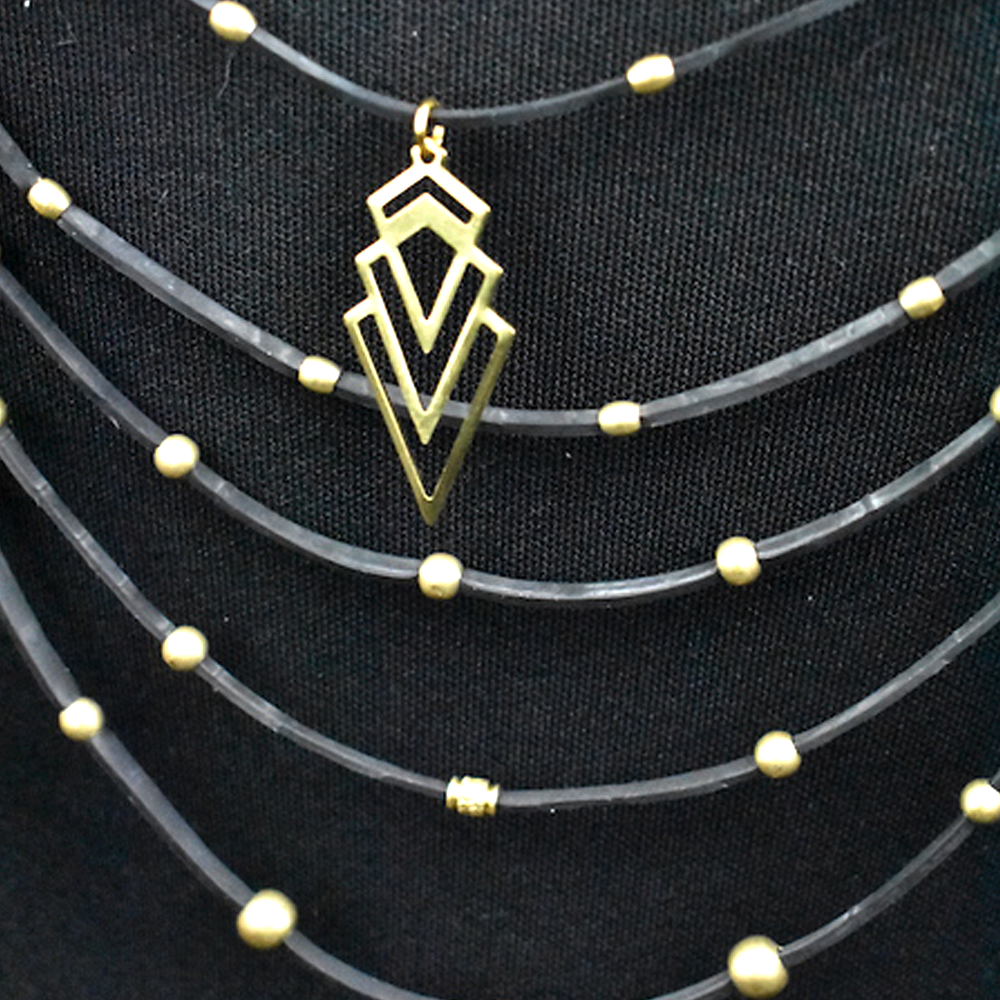 The fine straps are made from durable motorbike tyre tubes, while the shoulder elements are constructed from bicycle tubes. Small key rings connect the strings, allowing them to be easily detached and untangled if necessary – a functional and thoughtful detail that enhances durability and usability.