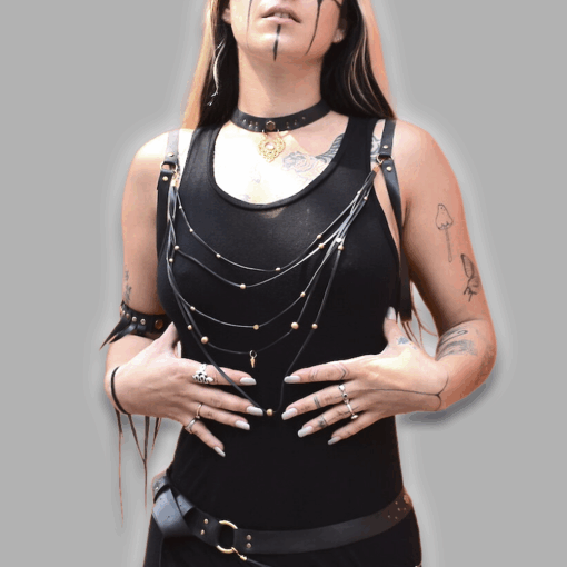 Optisch überzeugt das Harness in tiefem Schwarz mit wahlweise goldfarbenen Details (Messingperlen & Messingringe) oder silberfarbenen Elementen (Edelstahlperlen & Edelstahlringe). Die Kombination aus industriellem Material und eleganter Linienführung macht dieses Modell vielseitig tragbar – sowohl für Fetish-Events, Clubwear und Festivals als auch als avantgardistisches Highlight über minimalistischen Outfits.