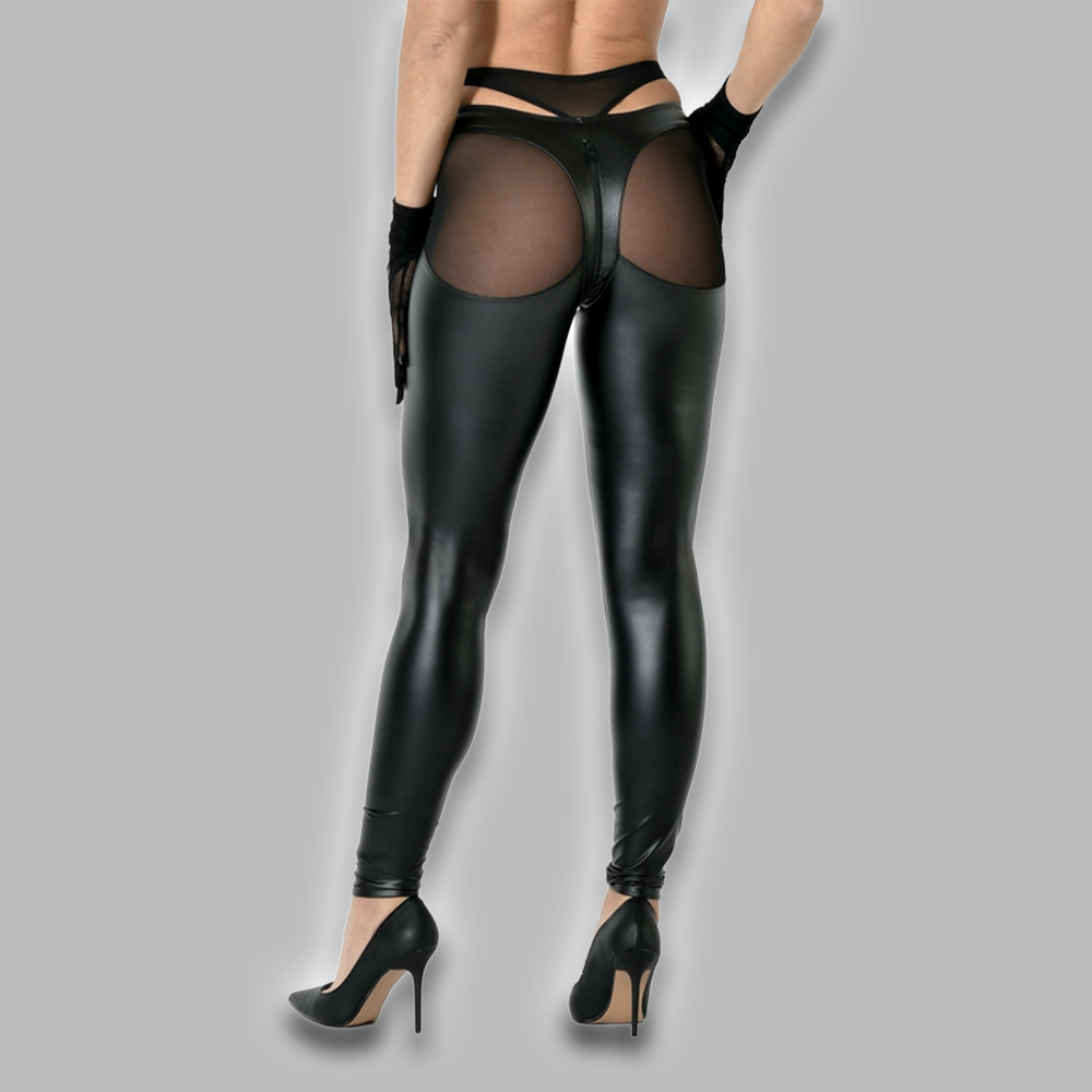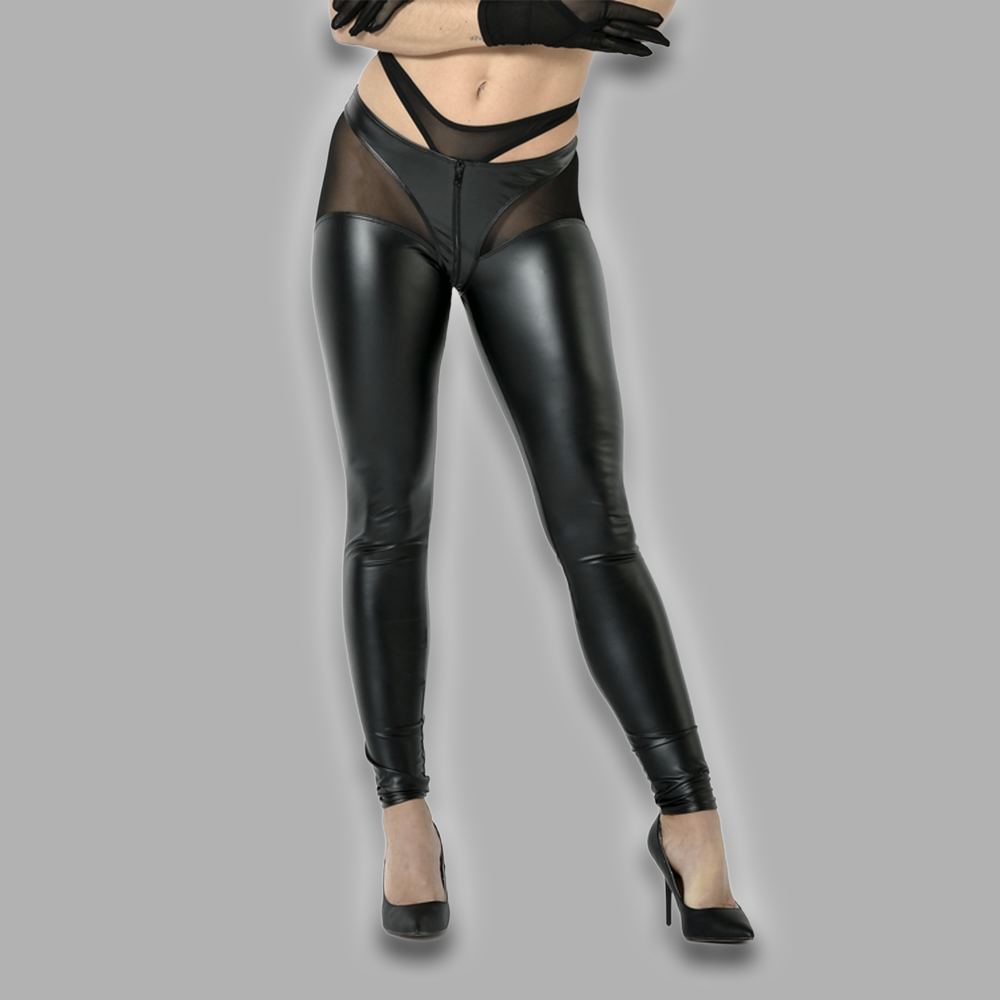 Die Electraia Slimpant Schwarz von Patrice Catanzaro vereint provokanten Wetlook mit raffinierter Transparenz und setzt deine Silhouette kompromisslos in Szene. Diese Leggings ist mehr als ein Kleidungsstück – sie ist ein Statement für moderne, selbstbewusste Looks mit avantgardistischer Fetish-Ästhetik. Die körpernahe Slim-Fit-Passform schmiegt sich wie eine zweite Haut an deine Beine und sorgt für einen formenden, femininen Effekt. Strategisch platzierte Mesh-Einsätze an Hüften, Oberschenkeln und Gesäß bringen gezielt Haut zum Vorschein und erzeugen ein spannendes Spiel aus Verhüllung und Offenheit. Der Kontrast zwischen matt glänzendem Wetlook-Material und transparenter Struktur verleiht dem Design eine außergewöhnliche visuelle Dynamik. Ein durchgehender Reißverschluss von vorne bis zum unteren Rücken ermöglicht flexible Styling-Optionen und unterstreicht den mutigen Charakter des Pieces. Das besondere Highlight: ein integriertes Mesh-Detail im Tanga-Look am Bund, das die Illusion von darunter getragener Lingerie erzeugt und dem Outfit eine zusätzliche, raffinierte Note verleiht. Der elastische Materialmix sorgt trotz enger Passform für hohen Tragekomfort und optimale Bewegungsfreiheit – perfekt für Clubwear, Events oder starke Fashion-Statements im Alltag. Kombiniere die Slimpant mit passenden Wetlook-Tops, Harness-Elementen oder auffälligen Accessoires und kreiere einen Look, der garantiert im Fokus steht.
