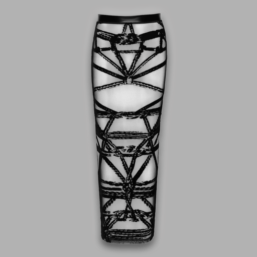 Embrace bold elegance with the Bondesque Long Skirt by Noir Handmade — a captivating piece that blends sensuality with modern sophistication. Crafted from semi-sheer flocked tulle with a unique bondage-inspired pattern, this skirt creates a striking, luxurious look. The high waistline flatters the figure, while the bold back slit adds both allure and movement. A soft powerwetlook waistband ensures comfort and a perfect fit, contrasting beautifully with the delicate texture of the fabric.