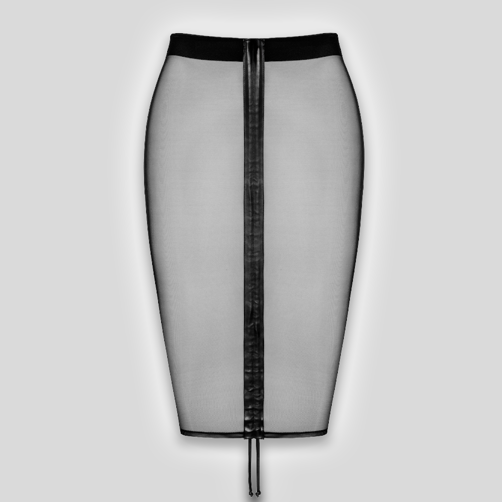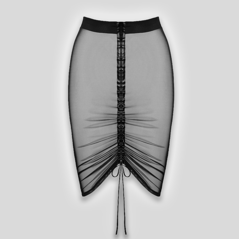 The Mesh Skirt with print by Noir Handmade is a bold statement piece that combines provocative transparency with refined functionality. Crafted from elastic sheer tulle, this knee-length skirt flows effortlessly with the body, creating a light yet striking silhouette.