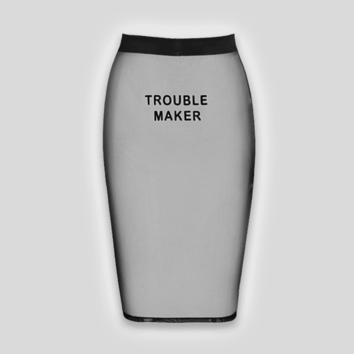 The soft mesh fabric gently adapts to the body, enhancing natural curves while offering a semi-transparent look that balances elegance and allure. A standout detail is the flocked “Troublemaker” print on the back, adding a rebellious and confident edge to the design.