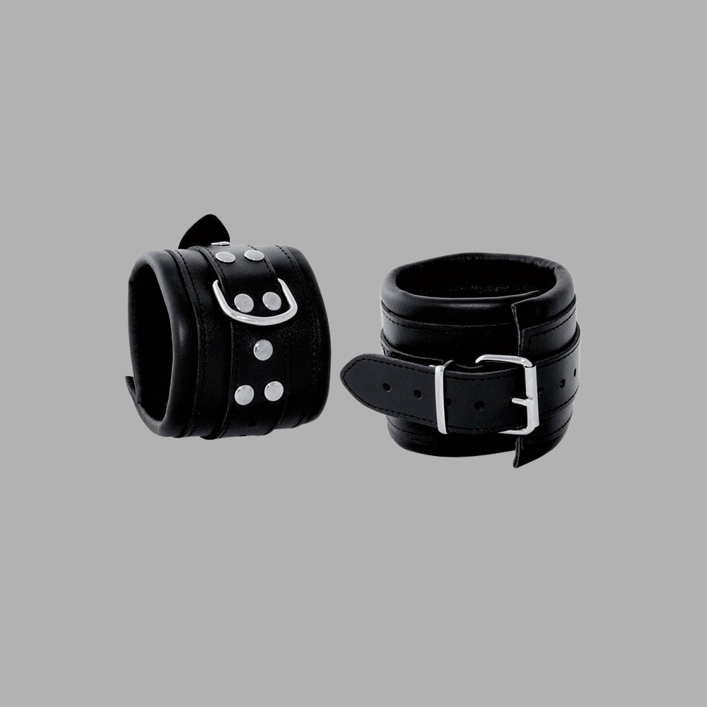 Padded leather ankle cuffs, black, approx. 8.0 cm wide. Ankle bracelet made of robust leather. Padded inside with soft leather. D-rings, riveted five times.