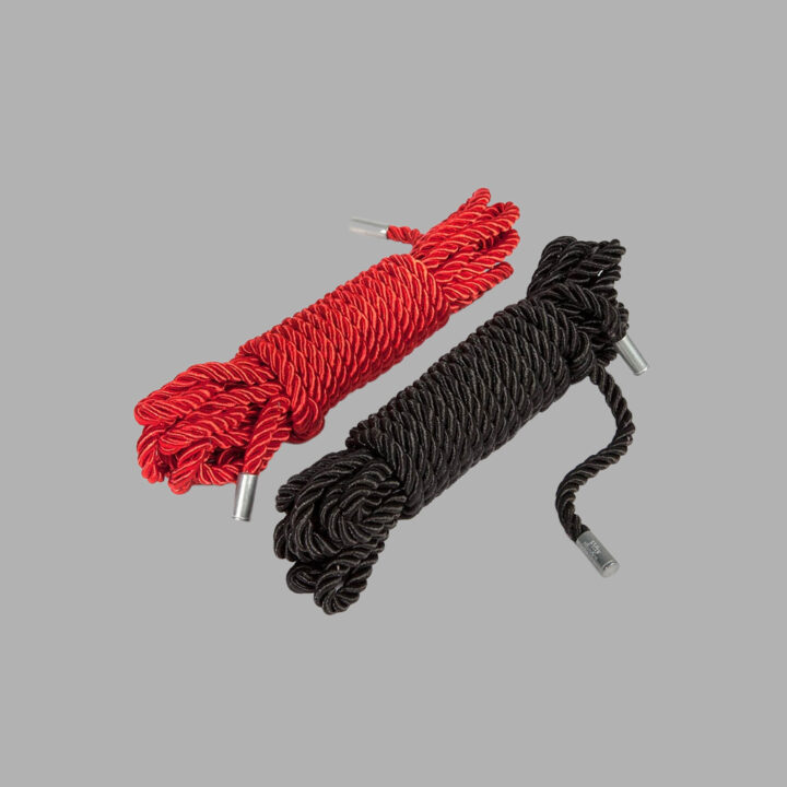 Stilvolle Kodelseile in schwarz und rot. An den Enden schöne Metallbeschläge mit 50 Shades of Grey Gravur. Mit 2 x 5 Metern Seil hat man eine gute Basis für erste Fesselspiele und leichte Fesselungen.