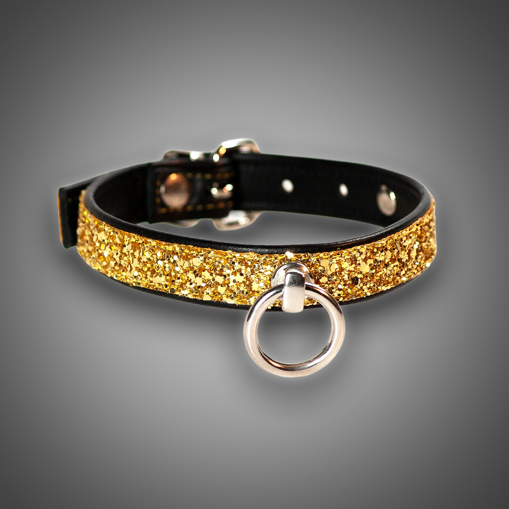 Extravagantes, funkelndes Halsband – 2,0 cm breit. Dieses moderne Statement-Halsband verbindet glamourösen Glanz mit hochwertiger Verarbeitung. Die Oberseite besteht aus plastifizierter Baumwolle, die mit unterschiedlich großen, glänzenden Splittern veredelt wurde, die glamourös in Gold funkeln. Die facettenreiche Oberfläche wirkt je nach Licht subtil schimmernd oder intensiv funkelnd. Die Kanten sind präzise paspeliert, die Unterseite sowie die Kanten bestehen aus echtem Premiumleder – weich, komfortabel und stabil zugleich. Der mittig platzierte O-Ring setzt einen klaren, modernen Akzent. Bei Tageslicht zeigt das Material einen dezenten, eleganten Schimmer; unter Club- und Nachtlicht entfaltet es ein kraftvolles, glamouröses goldenes Funkeln. Ein fashionstarkes, extravagantes Accessoire mit klarer Signature-Ästhetik.