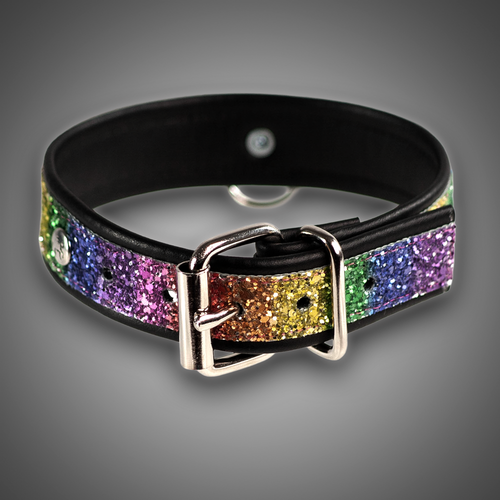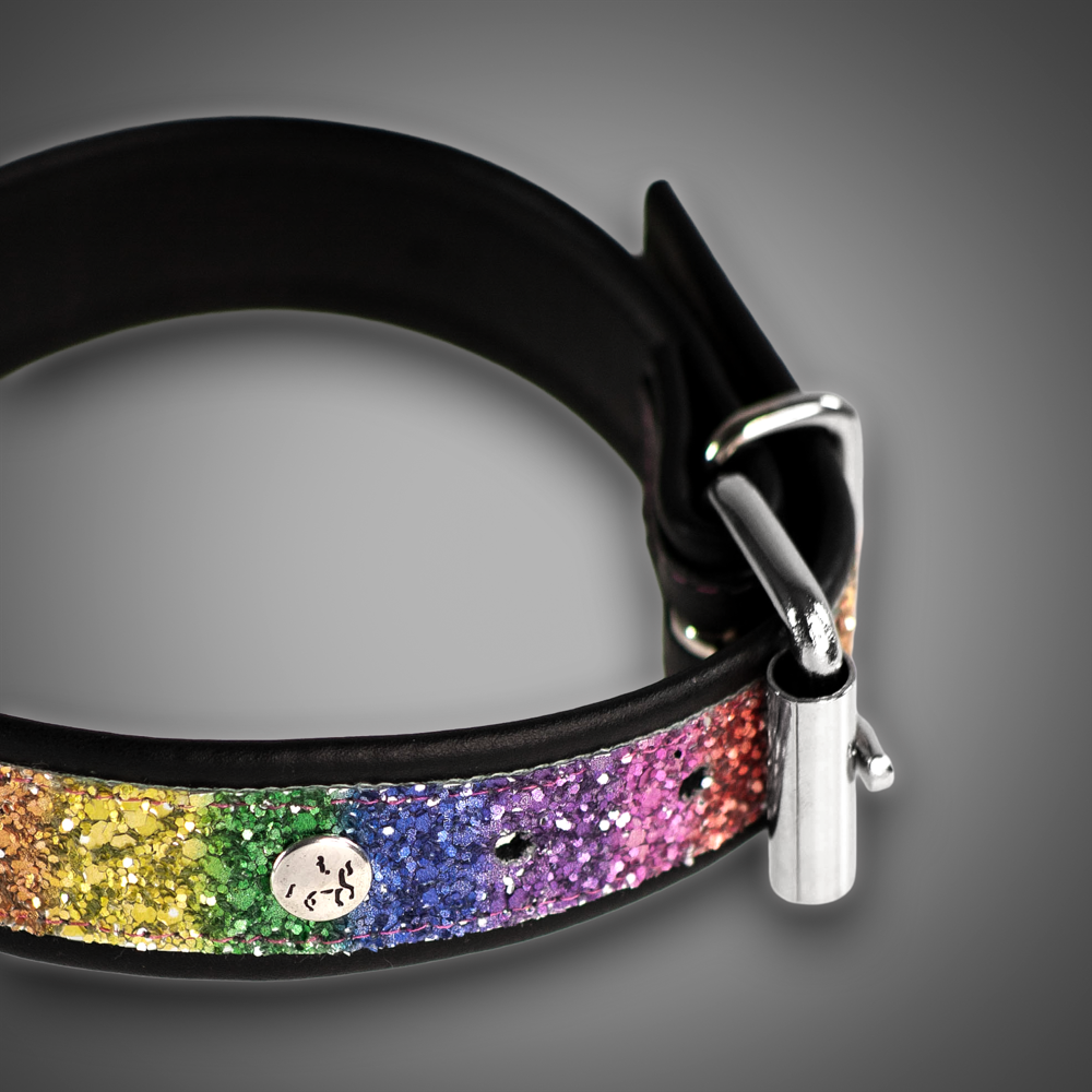Extravagantes, funkelndes Halsband in Regenbogenfarben – Pride Edition (3cm breit). Dieses besondere Halsband ist ein strahlender Blickfang und zeigt die gesamte Farbpracht des Regenbogens. Das Obermaterial besteht aus plastifizierter Baumwolle, die mit unterschiedlich großen, hochglänzenden Splittern veredelt wurde. Dadurch entsteht eine feste, facettenreiche Oberfläche, die je nach Licht subtil schimmert oder intensiv funkelt. Die geschliffenen Kanten und das weiche Lederfutter sorgen für hohen Tragekomfort. Der mittig platzierte O-Ring setzt einen klaren, modernen Akzent und rundet das Design stilvoll ab. Im Tageslicht zeigt sich ein dezenter Reflexeffekt, während das Halsband im Club- und Nachtlicht ein glamouröses, farbintensives Funkeln entfaltet – perfekt für Pride, Festivals, Mode-Looks und expressive Outfits. LIVE & LOVE your PRIDE. Handmade in Berlin – präzise gefertigt, modisch, einzigartig. Nur echt mit dem Schwarzer Reiter Pferdchen-Logo.