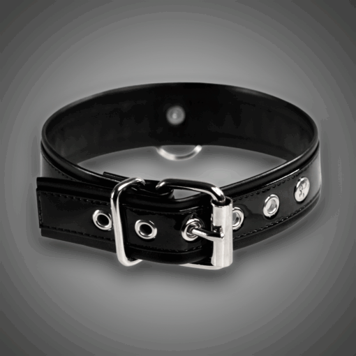 Veganer Choker aus schwarzem Lack. Handgemacht in Berlin, glänzend, verstellbar & kombinierbar mit Cuffs & Leine. Stilvoll & tierfreundlich.