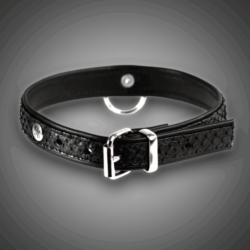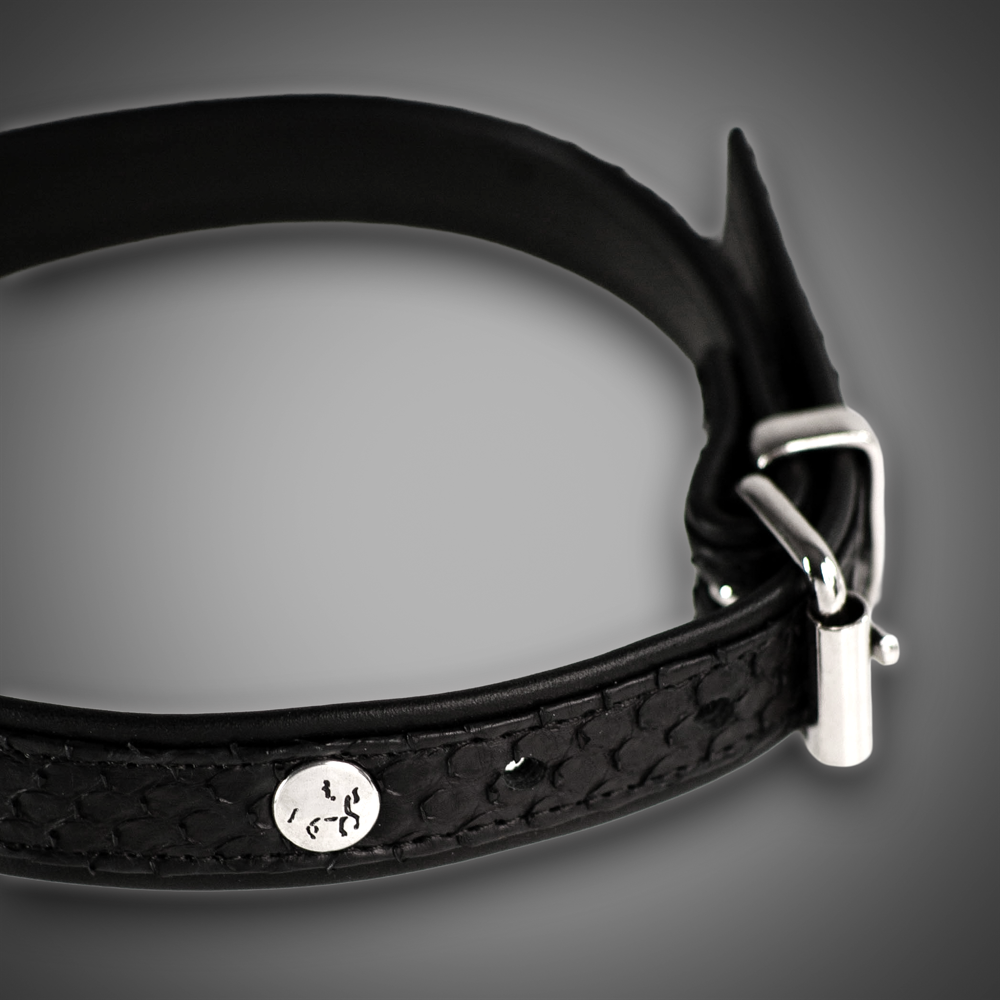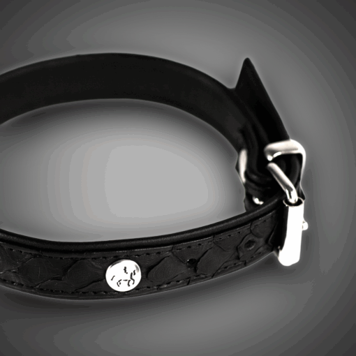 Luxury python leather collar (2.0 cm wide) with naturally varying scale pattern. Soft black cowhide lining, nickel-free stainless-steel O-ring, sturdy 2.0 cm buckle. Handmade in Berlin using certified CITES materials.