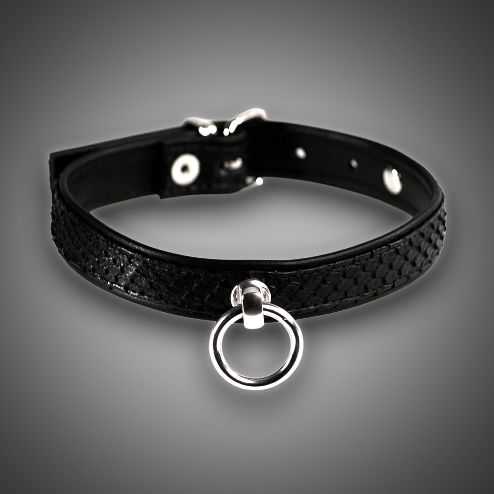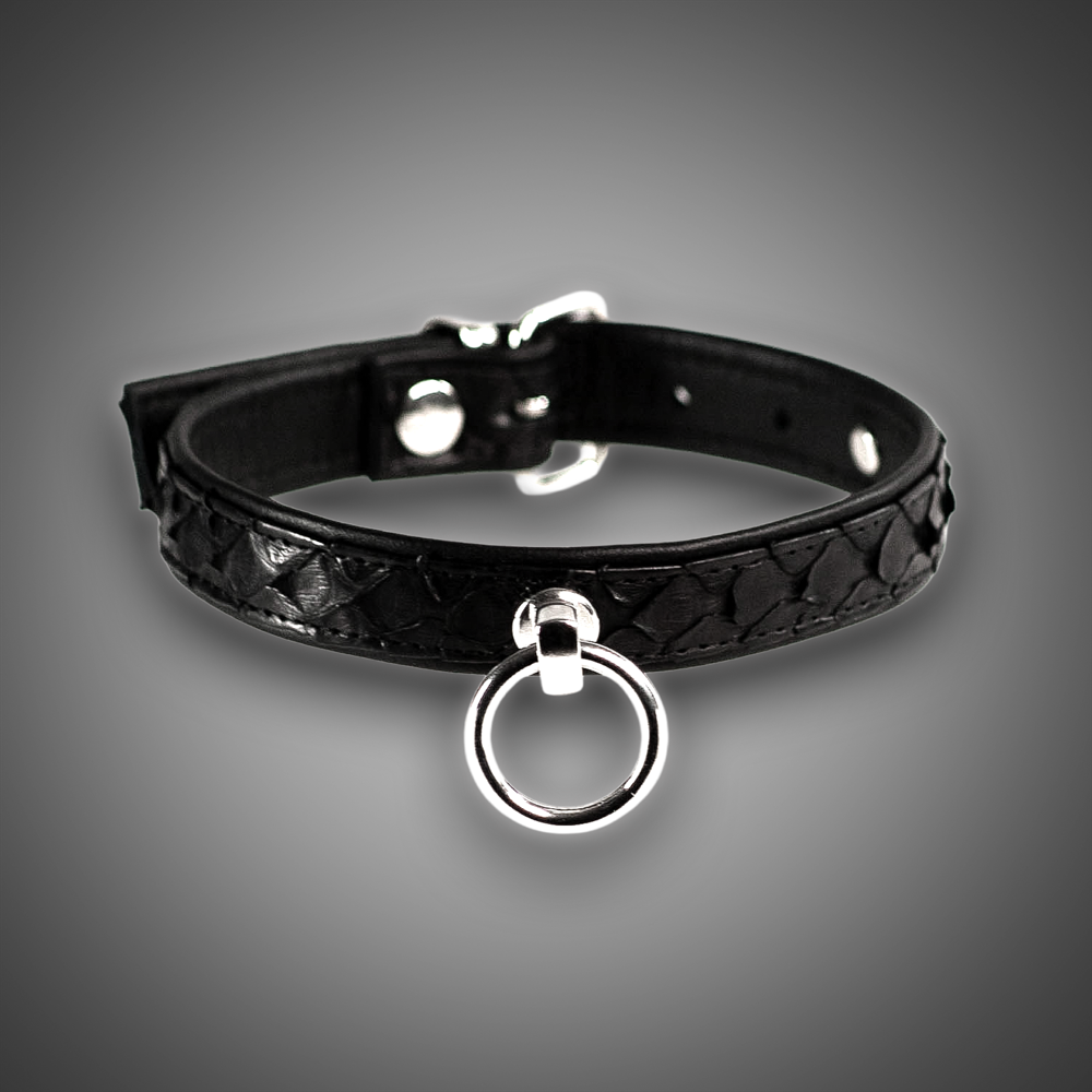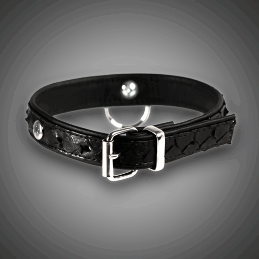 Luxuriöses Halsband aus echtem Pythonleder (2,0 cm breit) mit variierender, natürlicher Schuppung. Weich mit schwarzem Rindsleder gefüttert, zentraler nickelfreier Edelstahl-O-Ring, stabile 2,0 cm Dornenschließe. Handgefertigt in Berlin, CITES-zertifizierte Materialien.