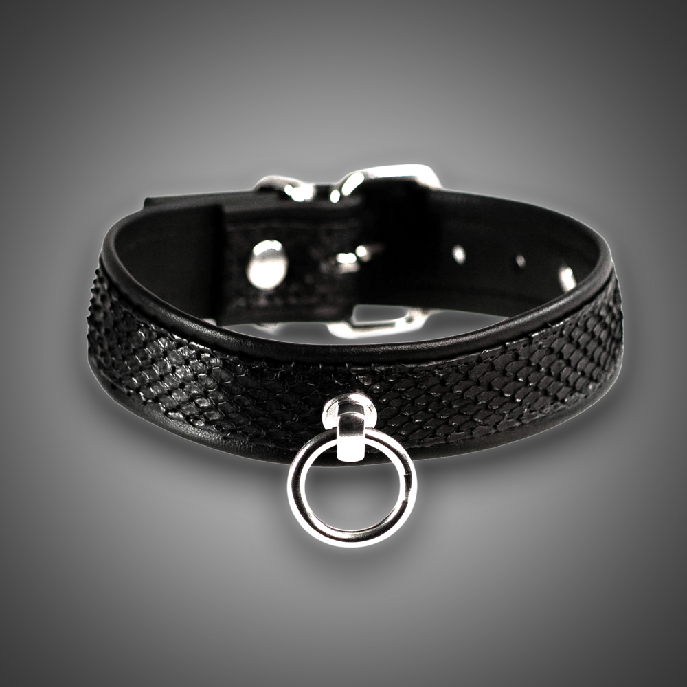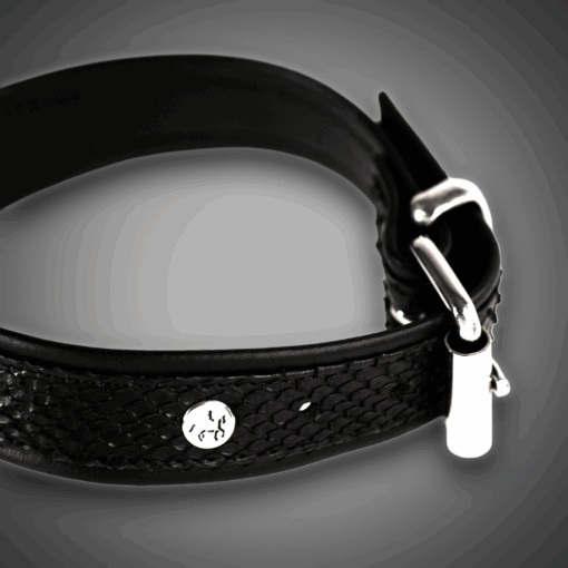 Luxuriöses Halsband aus echtem Pythonleder – 3,0 cm breit. Dieses elegante, schwarze und leicht glänzende Halsband besteht aus zertifiziertem Pythonleder deutscher Händler. Die natürliche Schuppung des Leders kann – je nach verwendeter Stelle der Haut – von fein und dezent bis etwas markanter variieren. Dadurch wird jedes Halsband zu einem einzigartigen Einzelstück. Der zentral platzierte, nickelfreie Edelstahl-O-Ring interpretiert das klassische O-Ring-Design modern und hochwertig.