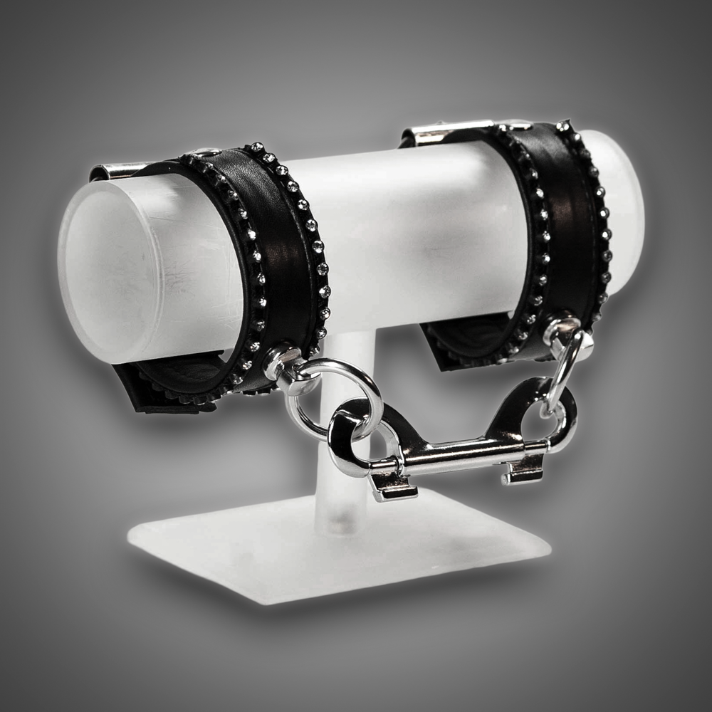 These 3.0 cm wide premium genuine-leather cuffs from the Schwarzer Reiter atelier combine clean lines, subtle leather sheen, and luxurious crystal sparkle. Crafted inside and out from softly fitting, lightly glossy premium cowhide, they sit comfortably against the skin and develop an elegant patina with use. Along the upper and lower edges run two rows of clear crystals—securely set and brilliantly sparkling. At the center of each cuff sits a polished, bolted stainless-steel O-ring, ideal for controlled restraint and aesthetic play design. The included double snap hook can be safely attached there. The 3.0 cm buckle ensures a reliable, understated closure. Naturally unmistakable thanks to the Schwarzer Reiter logo rivet. Handmade in Berlin – precise, high-quality, exclusive.