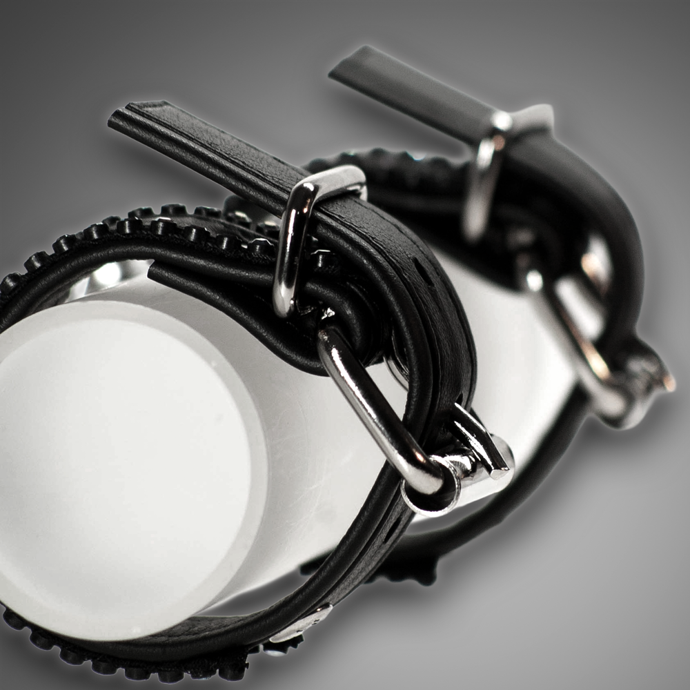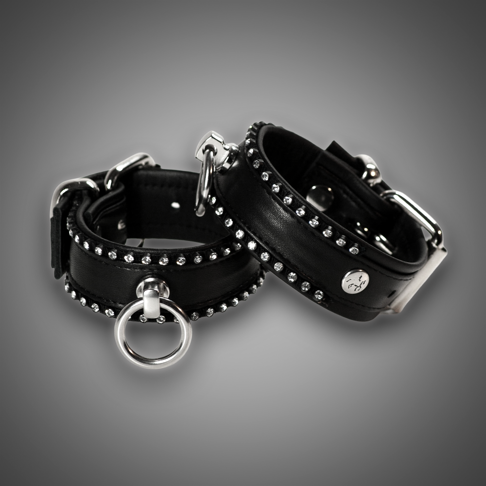 Diese 3,0 cm breiten Premium-Echtleder-Cuffs aus dem Schwarzer Reiter Atelier verbinden klare Linien, dezenten Lederglanz und luxuriöses Kristallfunkeln. Außen wie innen aus weich anliegendem, leicht glänzendem Premium-Rindsleder gefertigt, schmiegen sie sich angenehm an die Haut und entwickeln im Gebrauch eine edle Patina. Entlang der oberen und unteren Kante verlaufen zwei Reihen klarer Kristalle, stabil eingefasst und brillant funkelnd. Im Zentrum jedes Cuffs sitzt ein polierter, verschraubter Edelstahl-O-Ring, ideal für kontrollierte Fixierungen und ästhetisches Play-Design. Der mitgelieferte Doppelkarabiner lässt sich dort sicher einhaken. Die 3,0 cm Dornschließe garantiert einen zuverlässigen, dezenten Verschluss. Natürlich unverkennbar durch die Schwarzer Reiter Logo-Niete. Handmade in Berlin – präzise, hochwertig, exklusiv. Passend für Handgelenkumfang: 14,0 cm bis 19,0 cm
