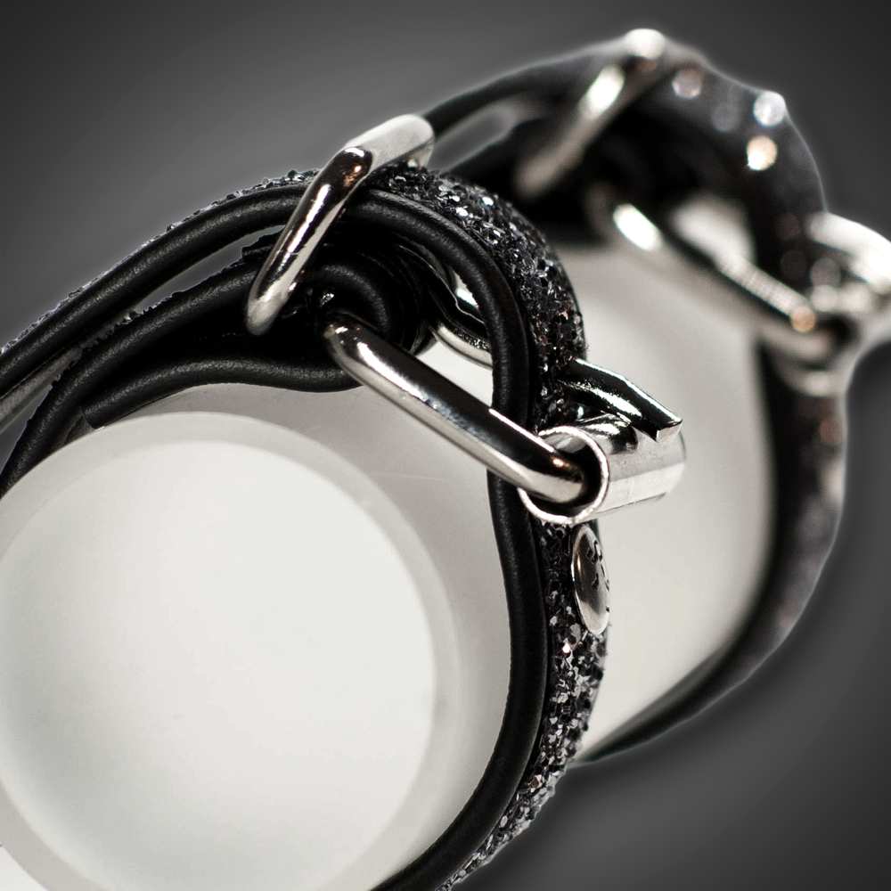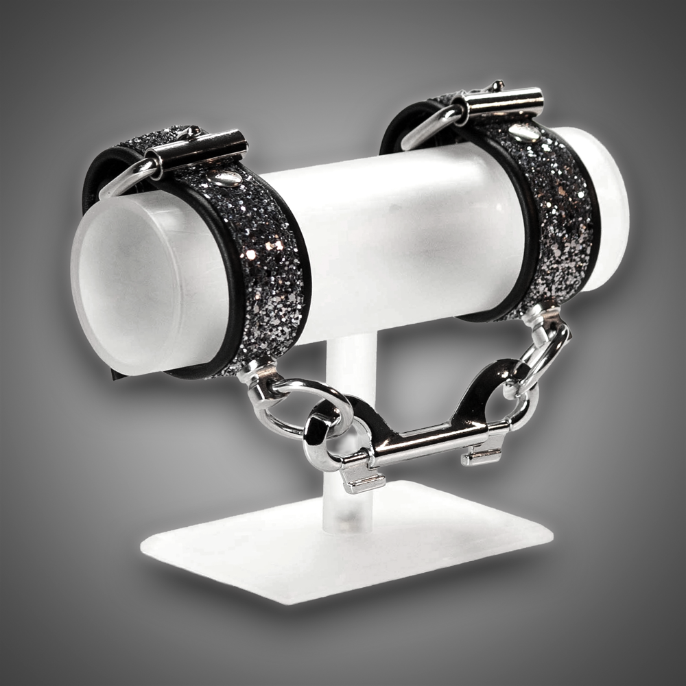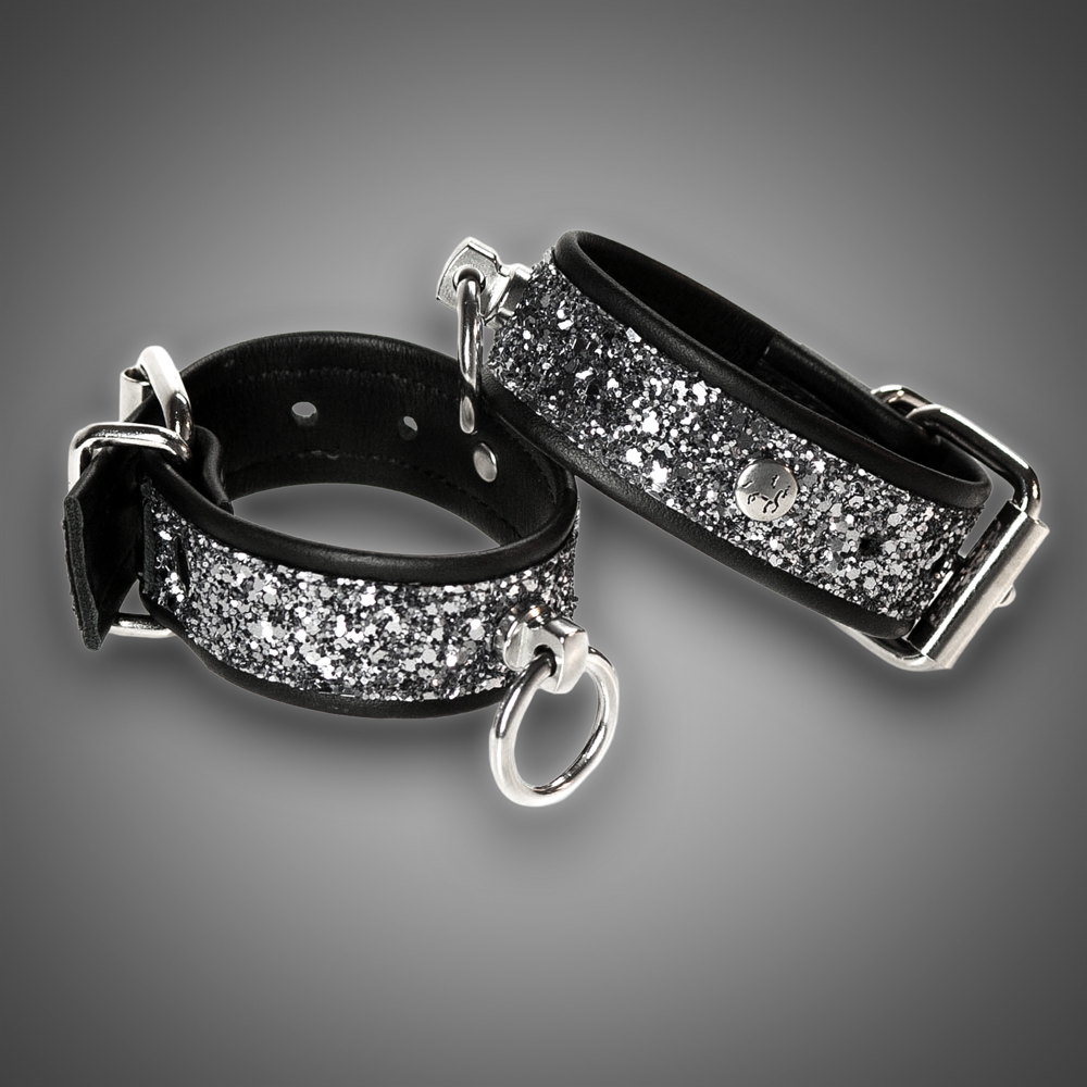 Die Silber-Diamond-Serie steht für intensiven Glanz und ein facettenreiches Lichtspiel. Das Obermaterial aus glänzenden, unregelmäßig verklebten Splittern erzeugt eine stabile, lebendig funkelnde Oberfläche. Die 3,0 cm breiten Cuffs wirken modern, klar und hochwertig. Geschliffene Kanten, weiches Lederfutter und ein mittig verschraubter O-Ring betonen das reduzierte Design. Mit dem beiliegenden Doppelkarabiner lassen sich beide Cuffs sicher verbinden – ideal für leichte Bewegungseinschränkungen oder als stilvolles Pride- und Festival-Accessoire. Bei Tageslicht dezent schimmernd, unter Clublicht intensiv funkelnd: ein markanter Blickfang für Fashion, Pride, Partys und kreative Outfits.