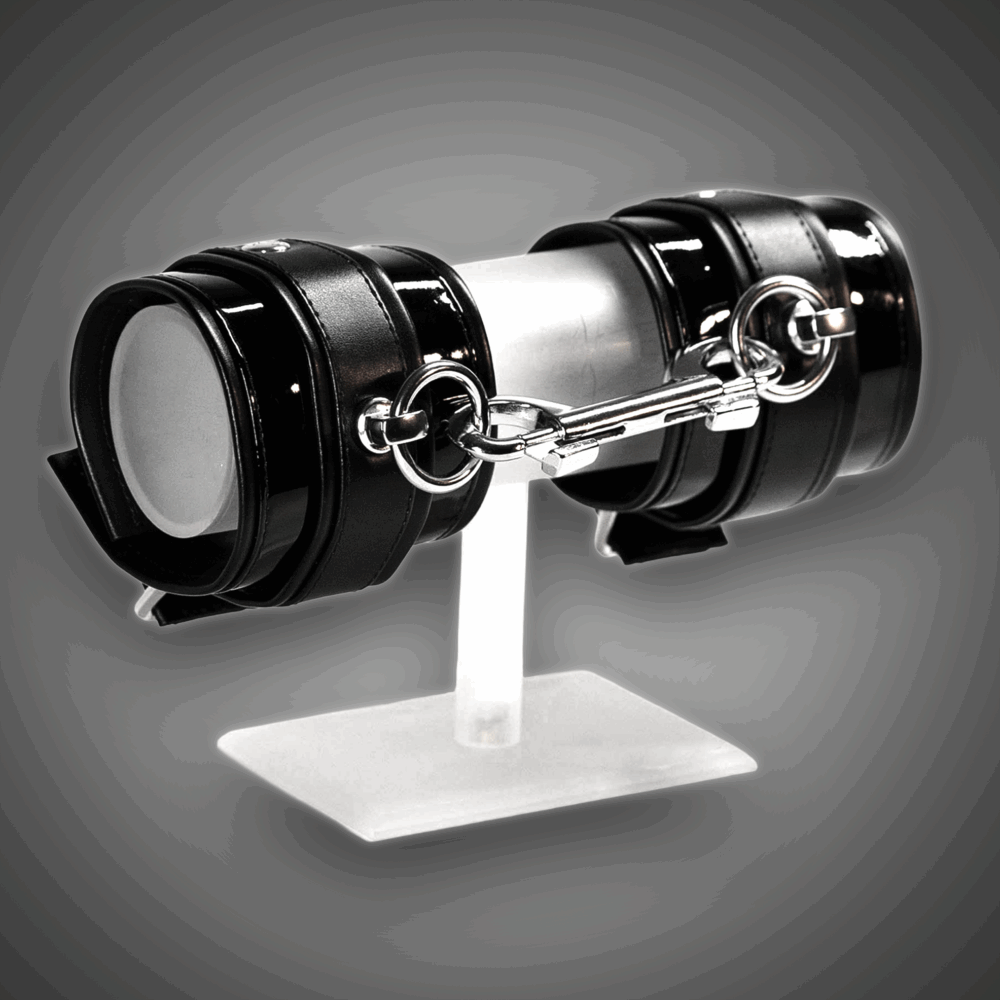 Das Untermaterial besteht aus weich anliegendem, leicht glänzendem Kunstleder, das sich deutlich angenehmer auf der Haut trägt, als das etwas festere Hochglanz-PVC, welches außen verarbeitet wurde. Das Obermaterial zeigt hochglänzendes Vinyl für einen intensiven Fetish-Look. Über dem Vinyl sitzt ein 3,0 cm breiter Kunstleder-Glanzstreifen, der einen klaren Kontrast setzt und die elegante Linienführung betont. Durch diesen Streifen lassen sich die Cuffs mit einer dezenten 3,0 cm Dornschließe schließen – schlank im Design, aber fest im Halt. So entsteht eine Kombination aus Eleganz, Anmut und stabiler 7-cm-Breite, ohne wuchtig zu wirken. Jedes Cuff ist mit einem Edelstahl-O-Ring inklusive Edelstahlschraube ausgestattet. Daran lässt sich der mitgelieferte Doppelkarabiner sicher einhaken – ideal zum Fixieren und für kontrollierte Bewegungseinschränkung. Nur echt mit der original Schwarzer Reiter Logo-Niete.