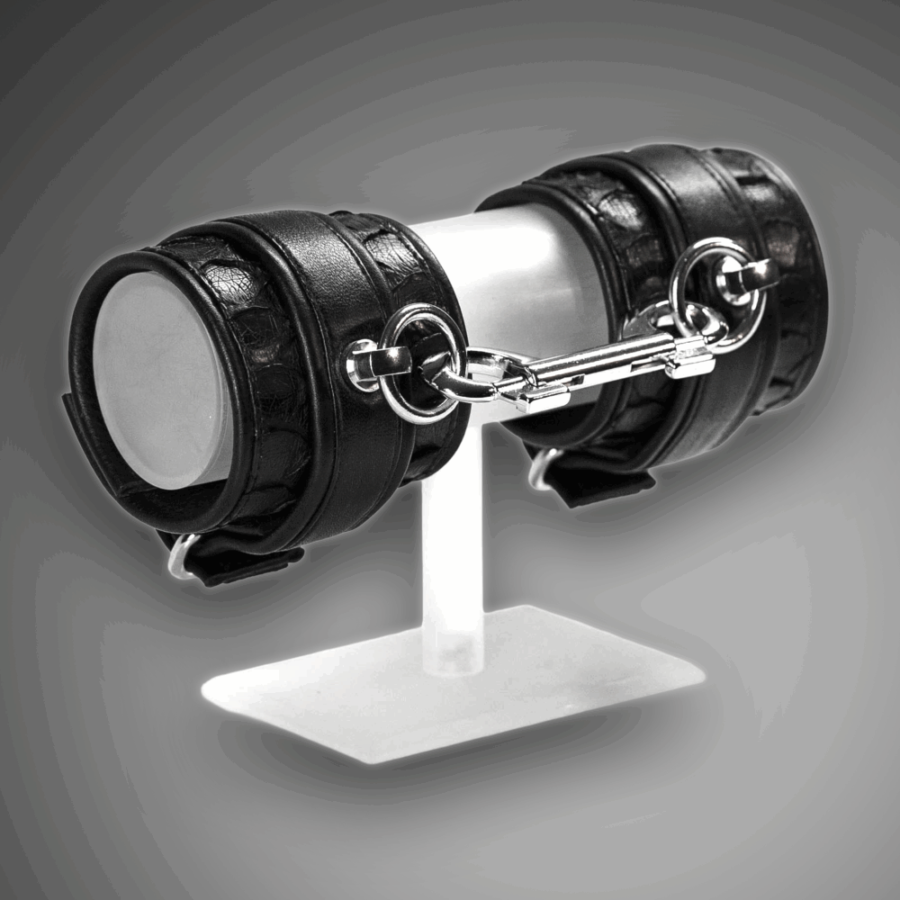 These high-end cuffs feature a wide belly-cut python leather base with a 3.0 cm glossy cowhide strip for a striking material contrast. The 3.0 cm buckle, stainless-steel O-rings, and included double carabiner ensure secure handling and stylish restriction. Soft black cowhide lining adds comfort, while the original Schwarzer Reiter logo rivet completes the signature look. Each pair is handmade in Berlin from certified materials. Python leather is a natural product — scale patterns may vary slightly. Key Features: python & cowhide material mix, fine scaling, stainless-steel hardware, double carabiner included, handmade in Berlin.