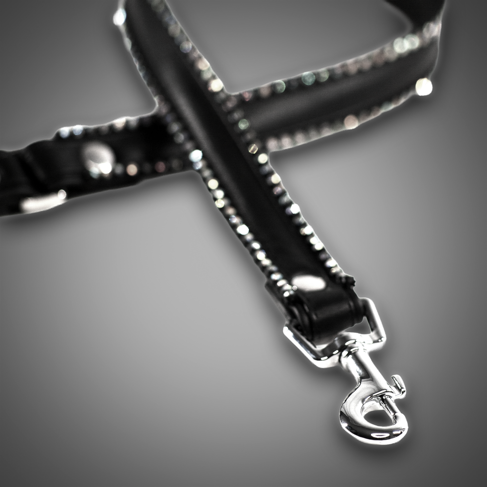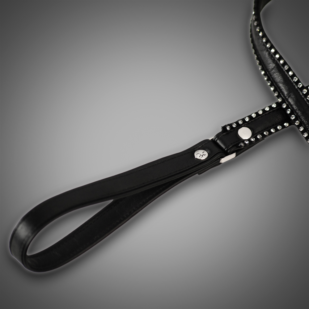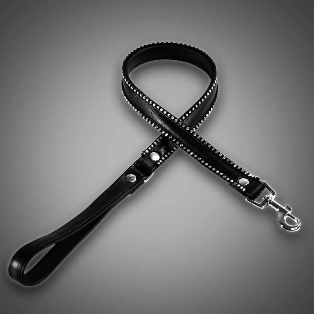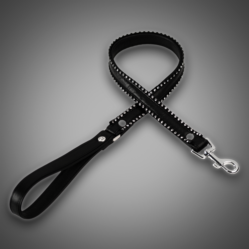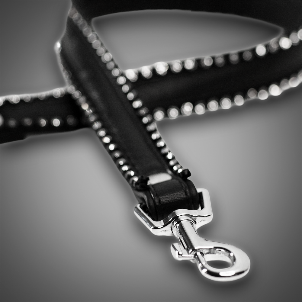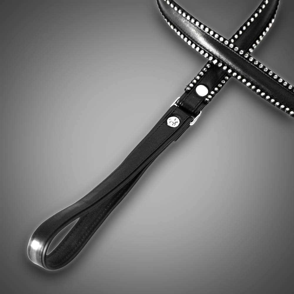 This luxurious crystal leash from the Schwarzer Reiter Atelier combines elegant genuine leather with sparkling accents. Along the edges, two rows of clear crystals create an intense play of light, giving the leash a refined and glamorous appearance. The crystals are precisely set, pleasantly smooth, and crafted with high-quality workmanship.
